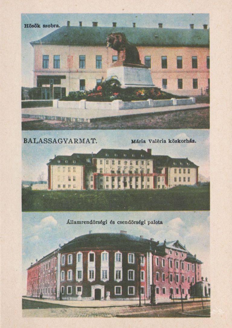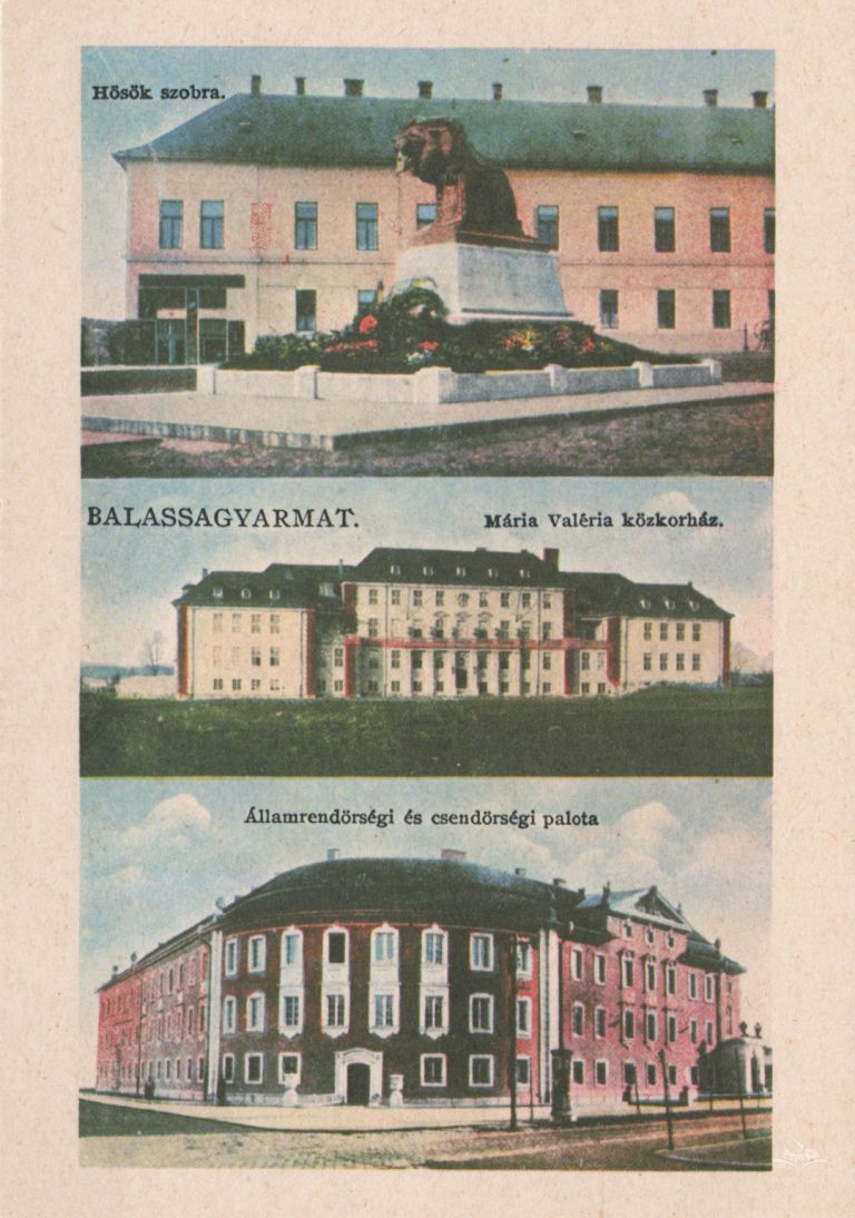 Balassagyarmat. Hösök szobra. Mária Valéria közkorház. Államrendörségi és csendörségi és palota