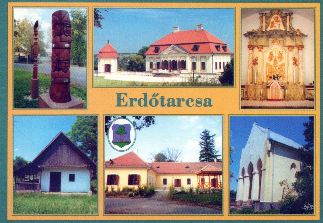A hatosztatú képeslapon erdőtarcsai részletek: a felső sorban bal oldalon részlet a faluközpontban lévő, Magyar Mihály helyi alkotó faszobraival díszített Milleniumi emlékparkból, középen a Szentmiklóssy-Kubinyi Kastélyszálló, jobb oldalon a katolikus Mindenszentek-templom oltára. Az alsó sorban bal oldalon felújított parasztház, középen az Önkormányzat épülete, a kép bal felső sarkában Erdőtarcsa címerével, jobb oldalon a neogótikus evangélikus kápolna (feltehetően Ybl Miklós tervezte, 1858-ban építették, 2005-ben újították fel).