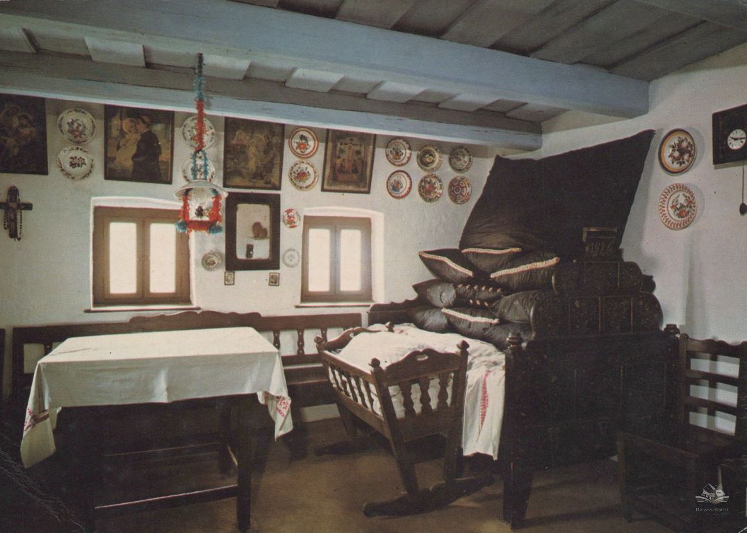 A képeslapon a hollókői Falumúzeum berendezett, utcára néző szobája, a házbelső a múlt század első felének paraszti világát idézi.
