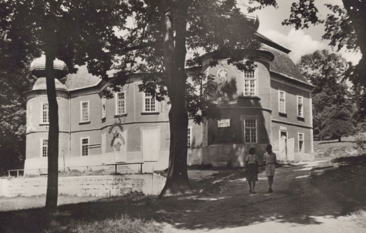 A képeslapon a kisterenyei Népkert részlete, a háttérben a Gyürky–Solymossy-kastély