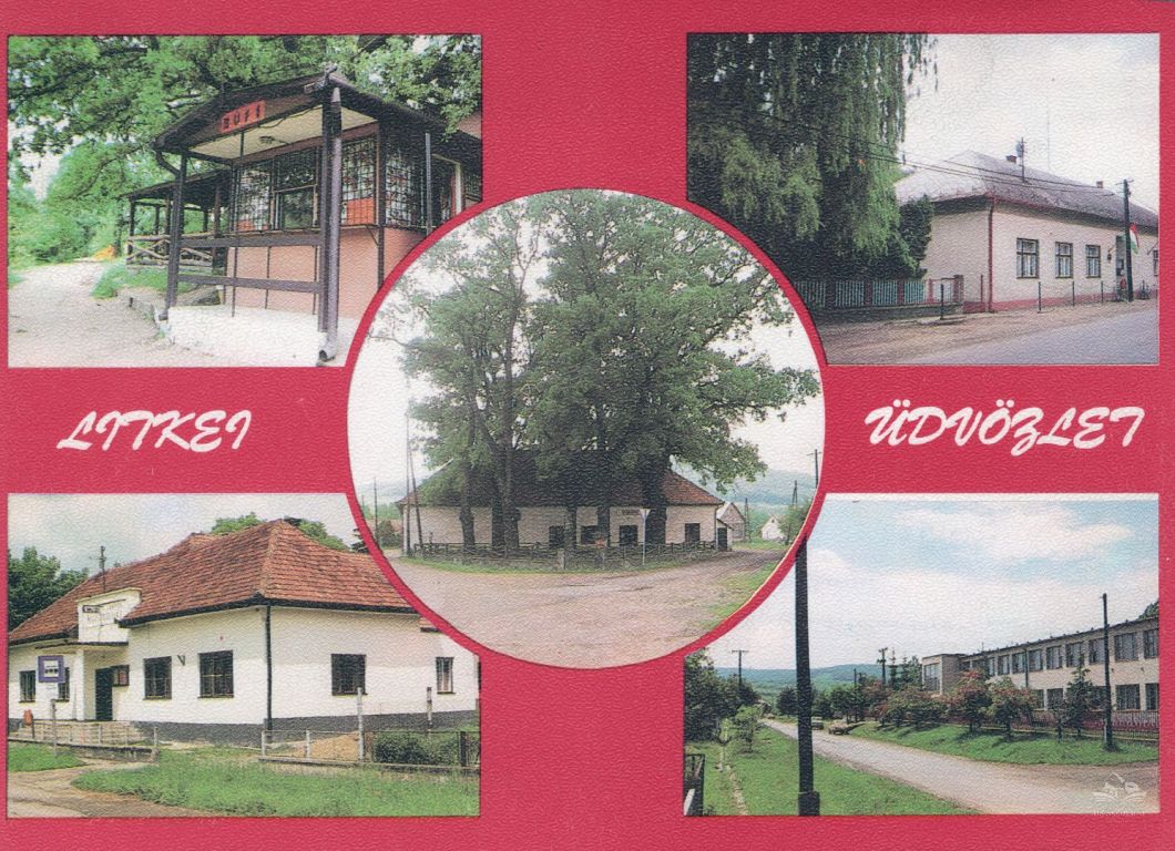 Az ötosztatú képeslapon szimmetrikus elrendezésben 2-2 fekvő felvétel, középen 1 kerek fotó, felirata "Litkei üdvözlet"; a felső sorban egy büfé építmény, mellette a Községháza, az alsó sor bal oldali képén a Kultúrház, a jobb oldalin az Általános Iskola és Napköziotthonos Óvoda épülete látható