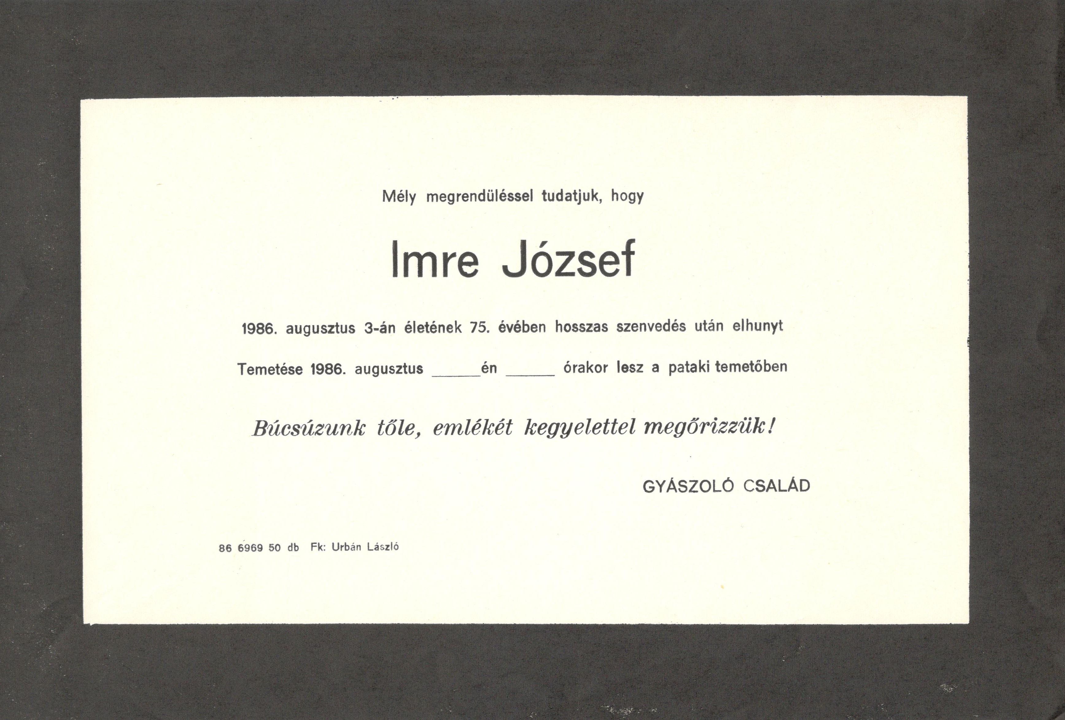 Gyászjelentés Imre József haláláról