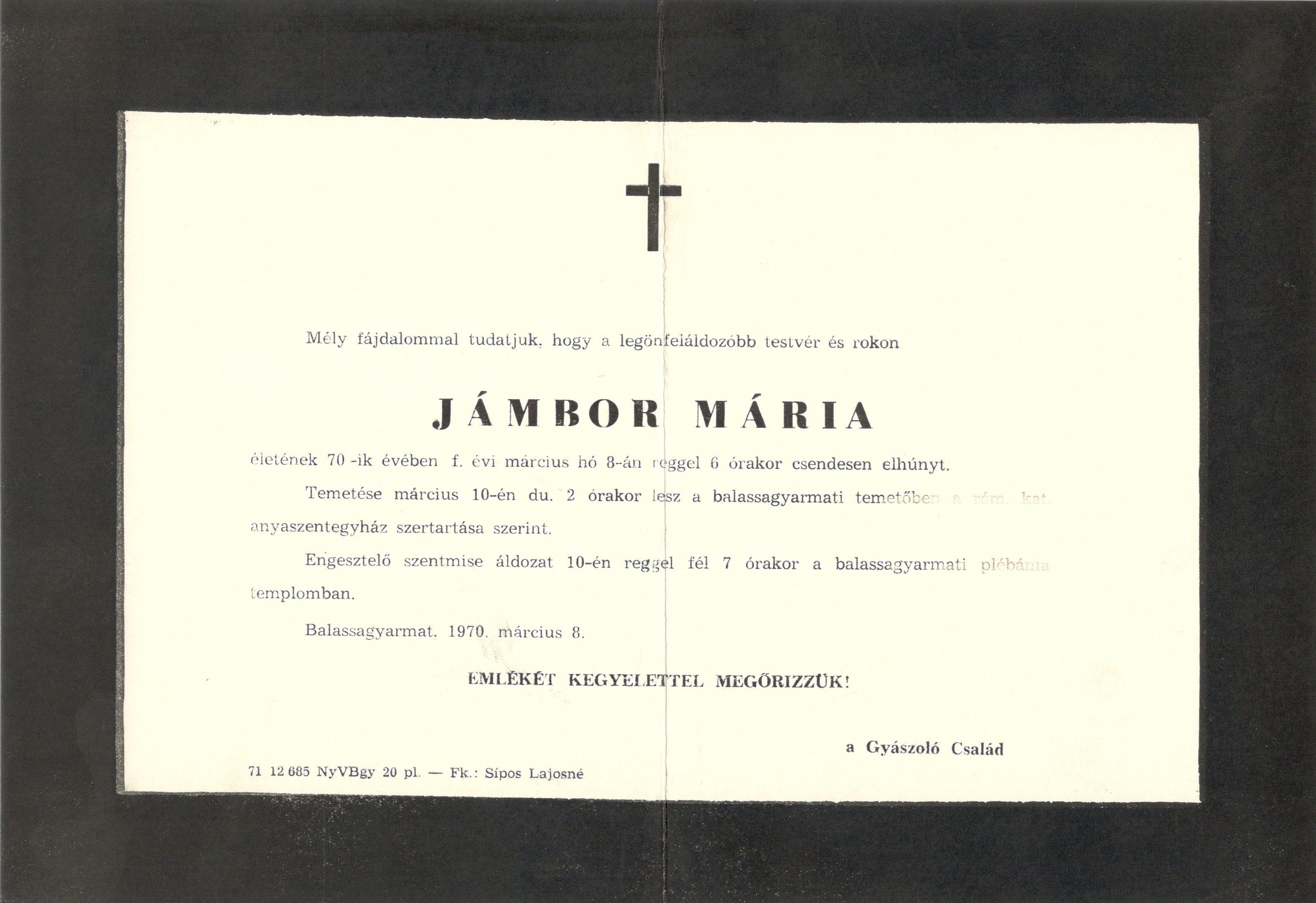 Temetése március 10-én du. 2 órakor lesz a balassagyarmati temetőben a róm. kat.