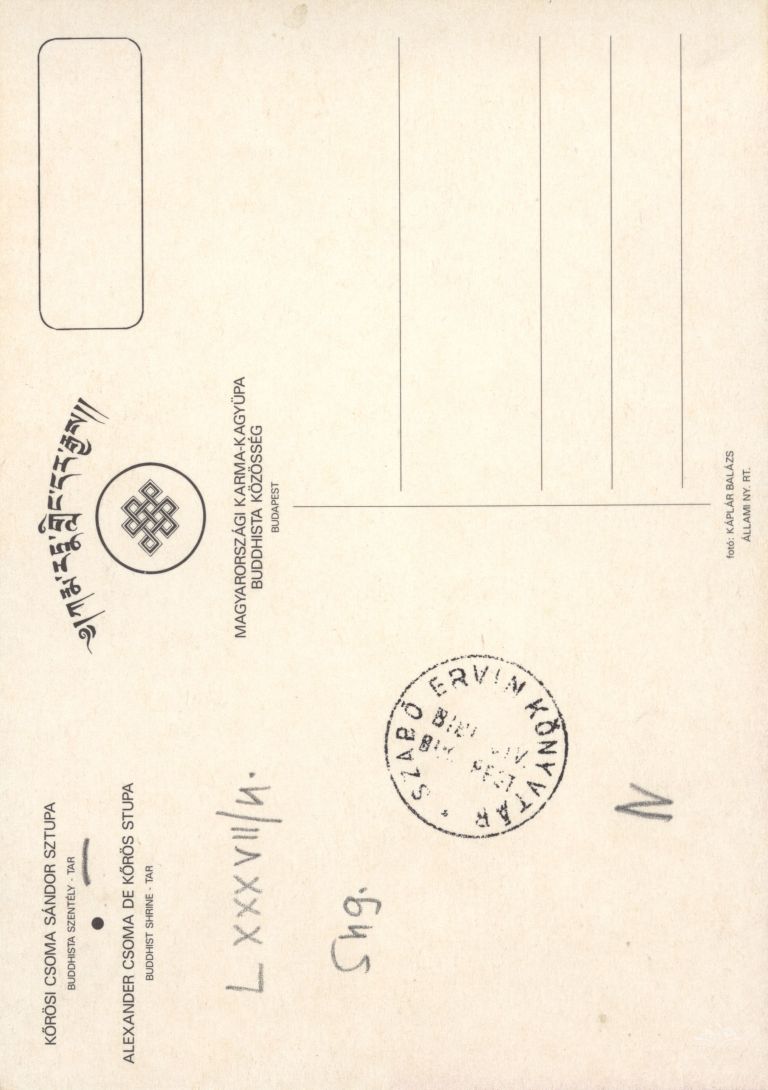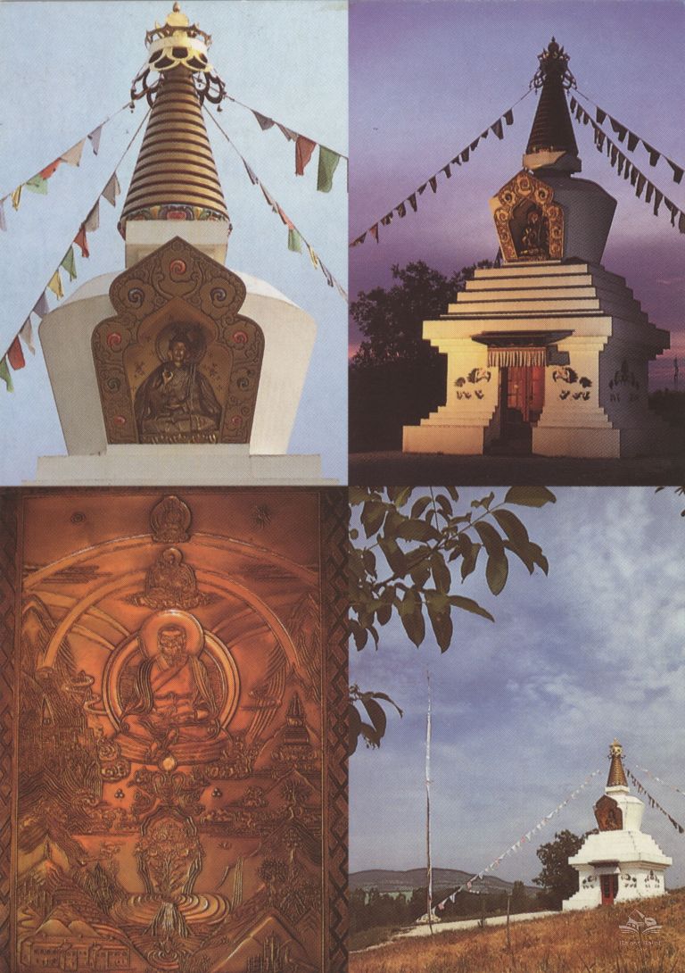 A négyosztatú képeslapon a tari Buddha Park – Kőrösi Csoma Sándor Emlékparkban található a Kőrösi Csoma Sándor emlékére emelt kegyeleti emlékmű, a Békesztúpa