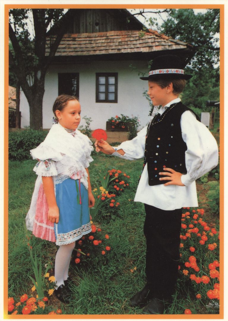 A képeslapon terényi népviseletbe öltözött leány és fiú