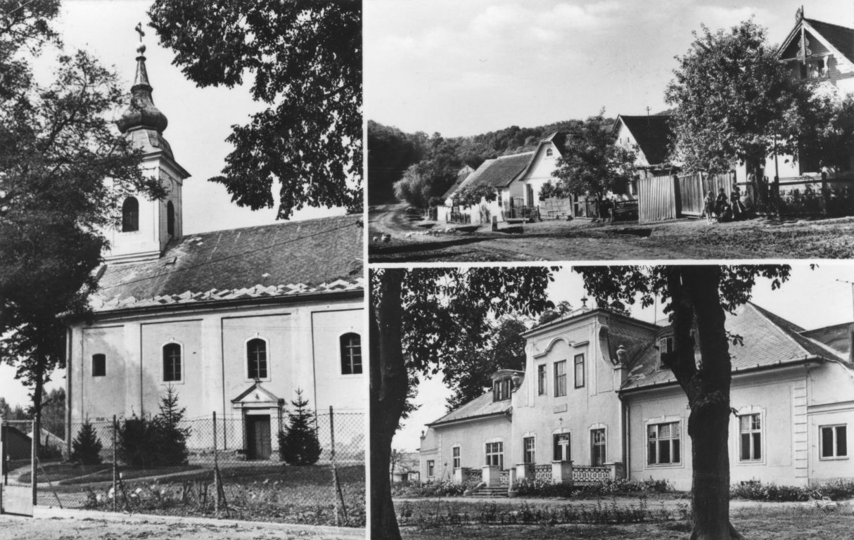 A háromosztatú képeslapon Tolmács község részletek - a római katolikus templom (Szent Lőrinc templom), utcarészlet, barokk jellegű kastély (volt Szentiványi kastély)