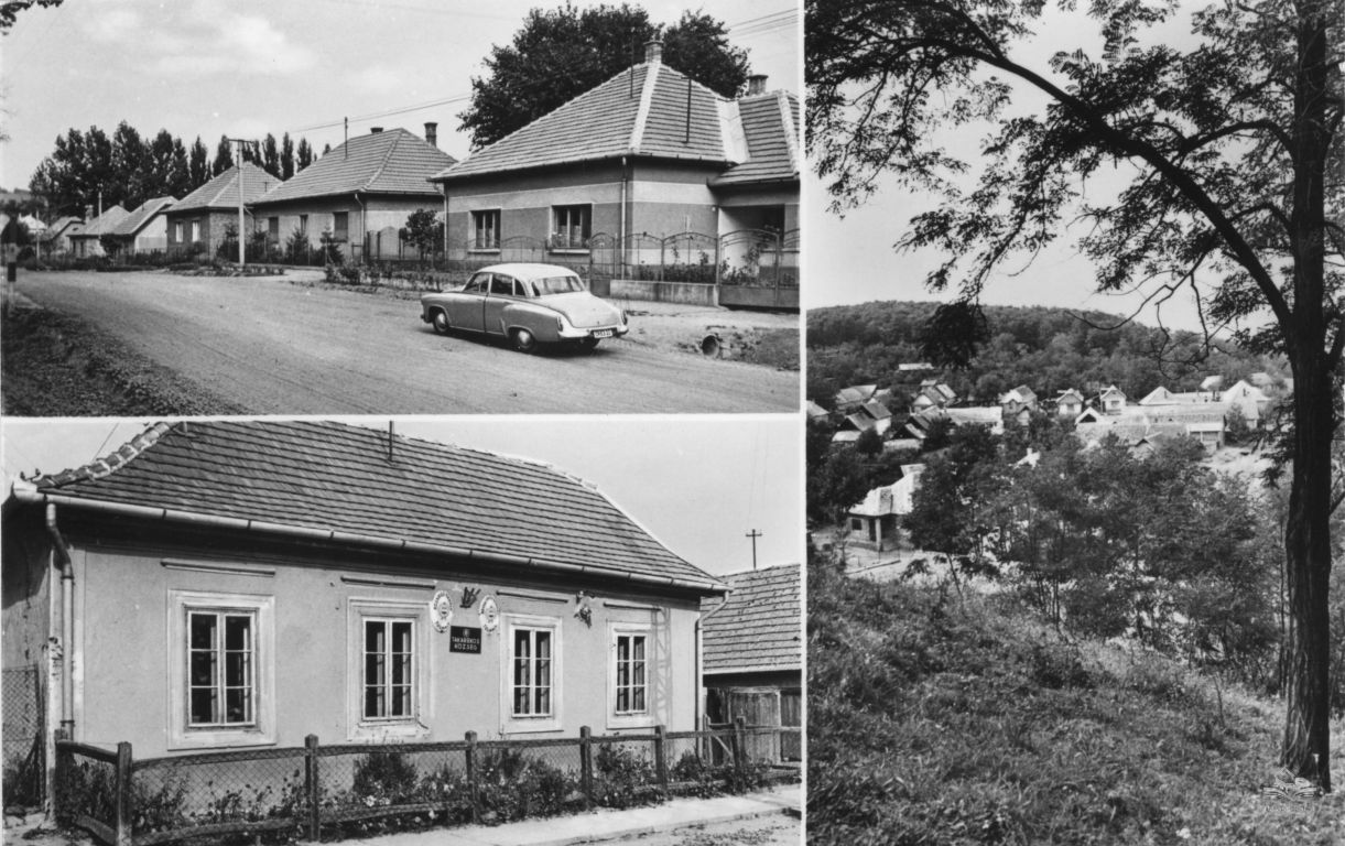 A háromosztatú képeslapon Tolmács község részletek - utcarészlet lakóházakkal, mellette a Községi Tanács Erdőkémiai irodahelyiség épületével homlokzatán Takarékos község tábla, jobbra látkép