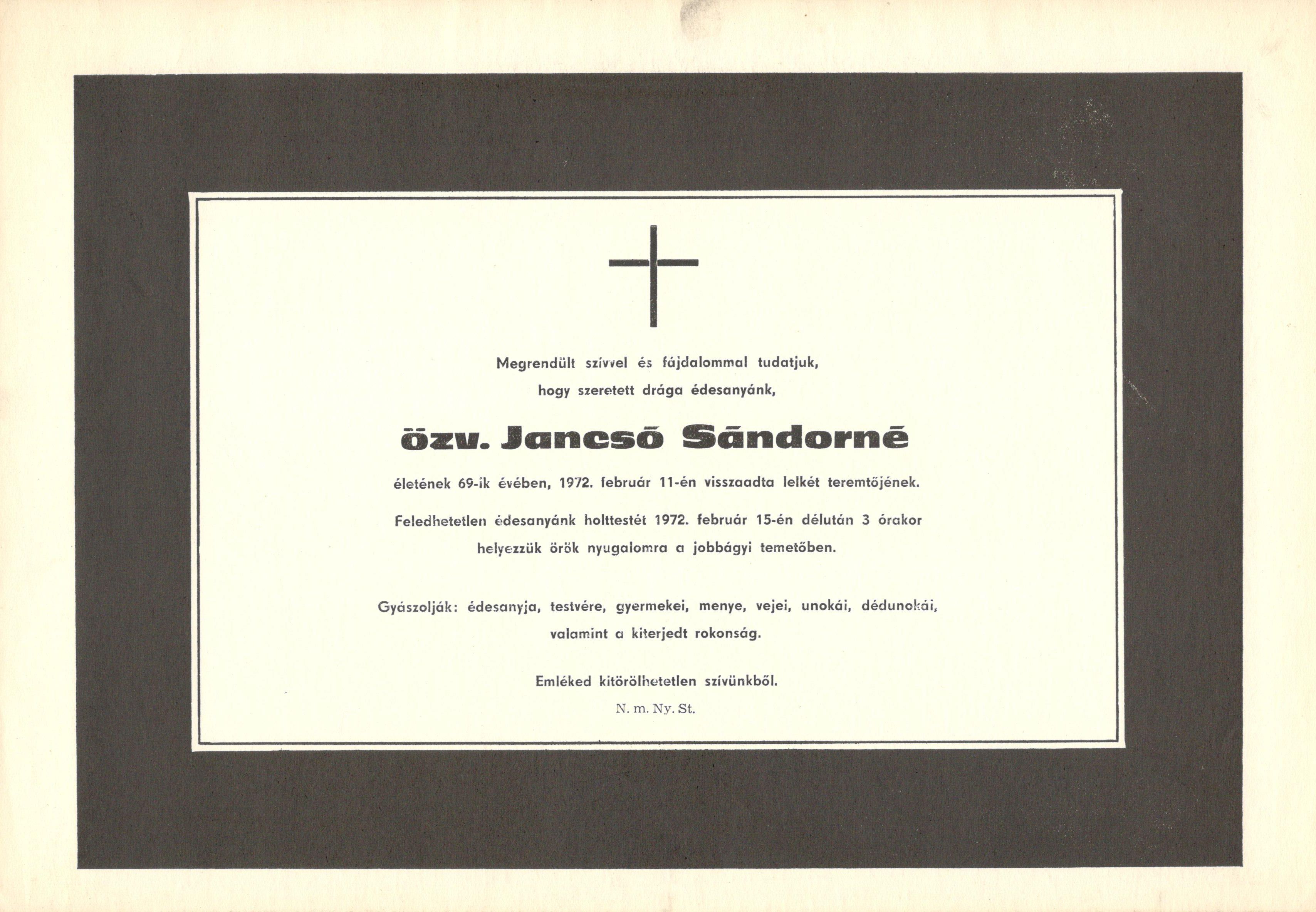 Gyászjelentés özv. Jancsó Sándorné haláláról