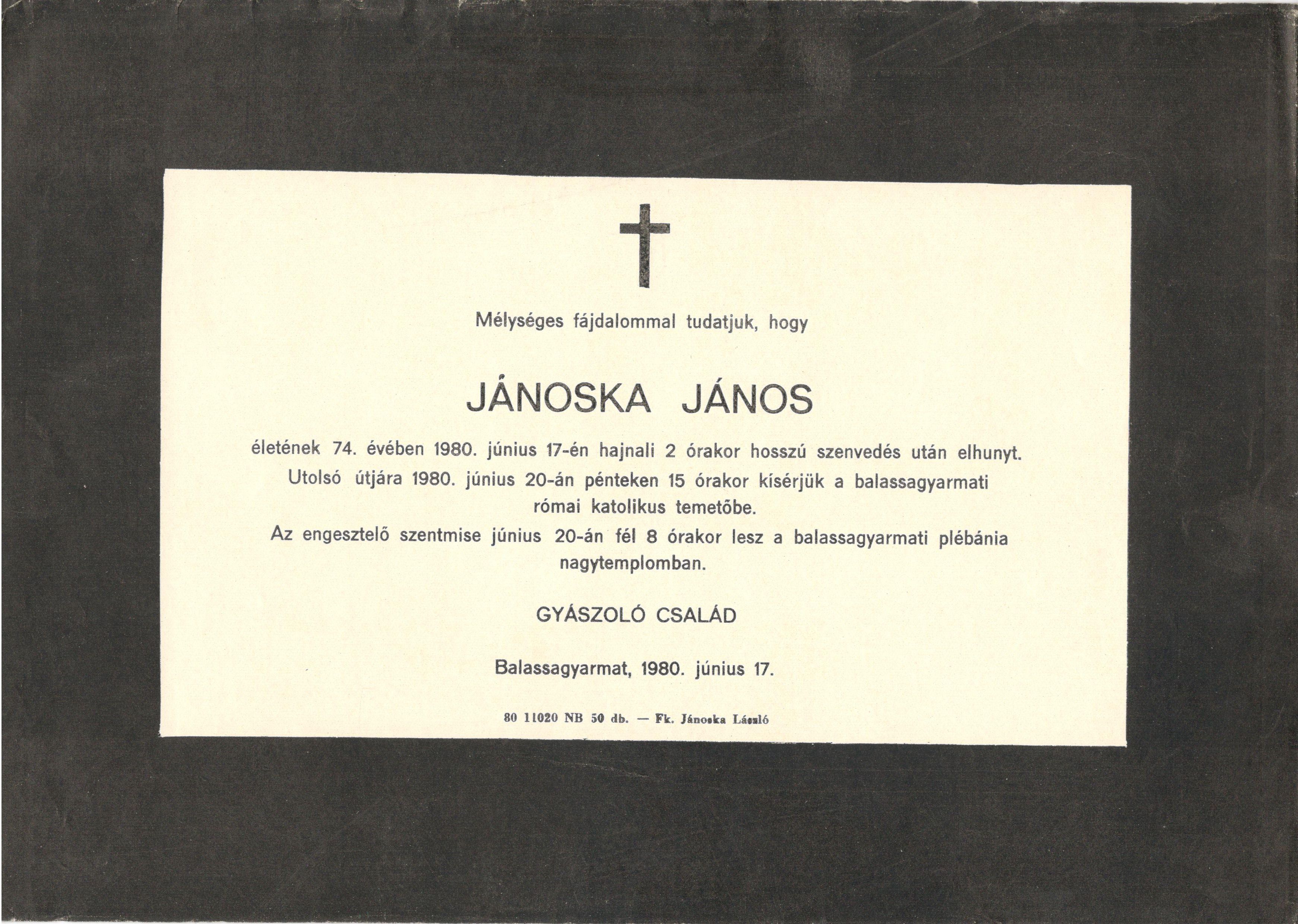 Utolsó útjára 1980. június 20-án pénteken 15 órakor kísérjük a balassagyarmati