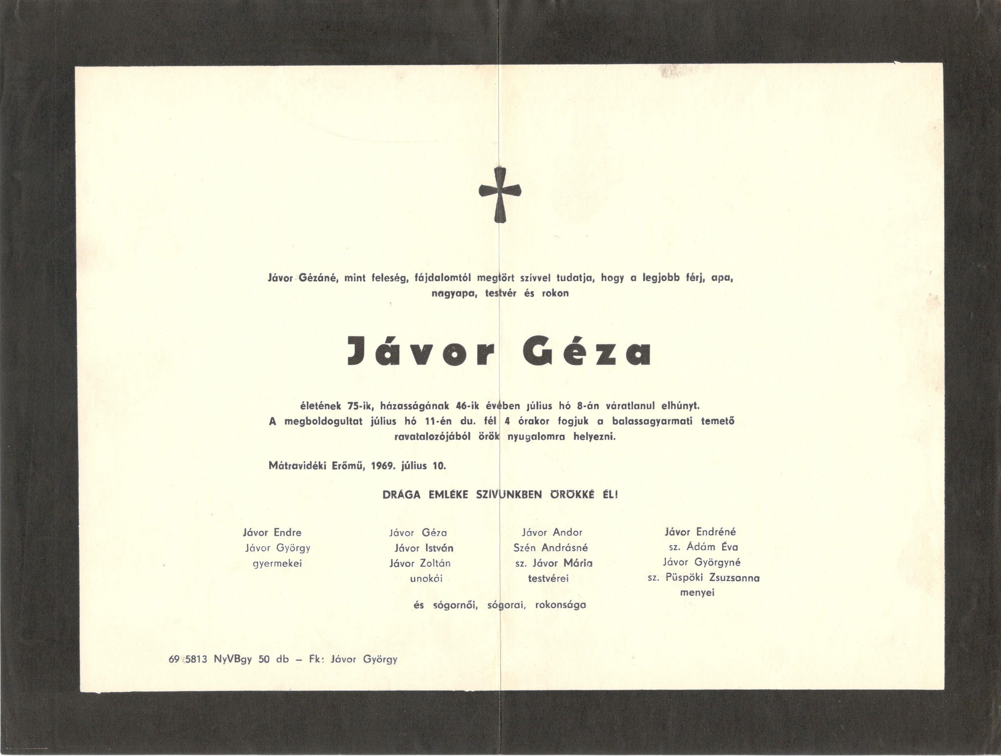Gyászjelentés Jávor Géza haláláról