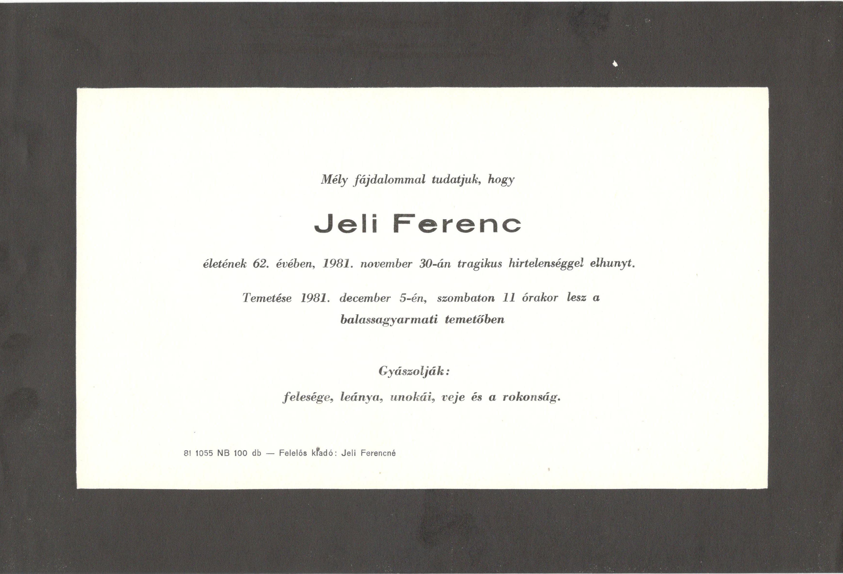 Temetése 1981. december 5-én, szombaton 11 órakor lesz a balassagyarmati temetőben.