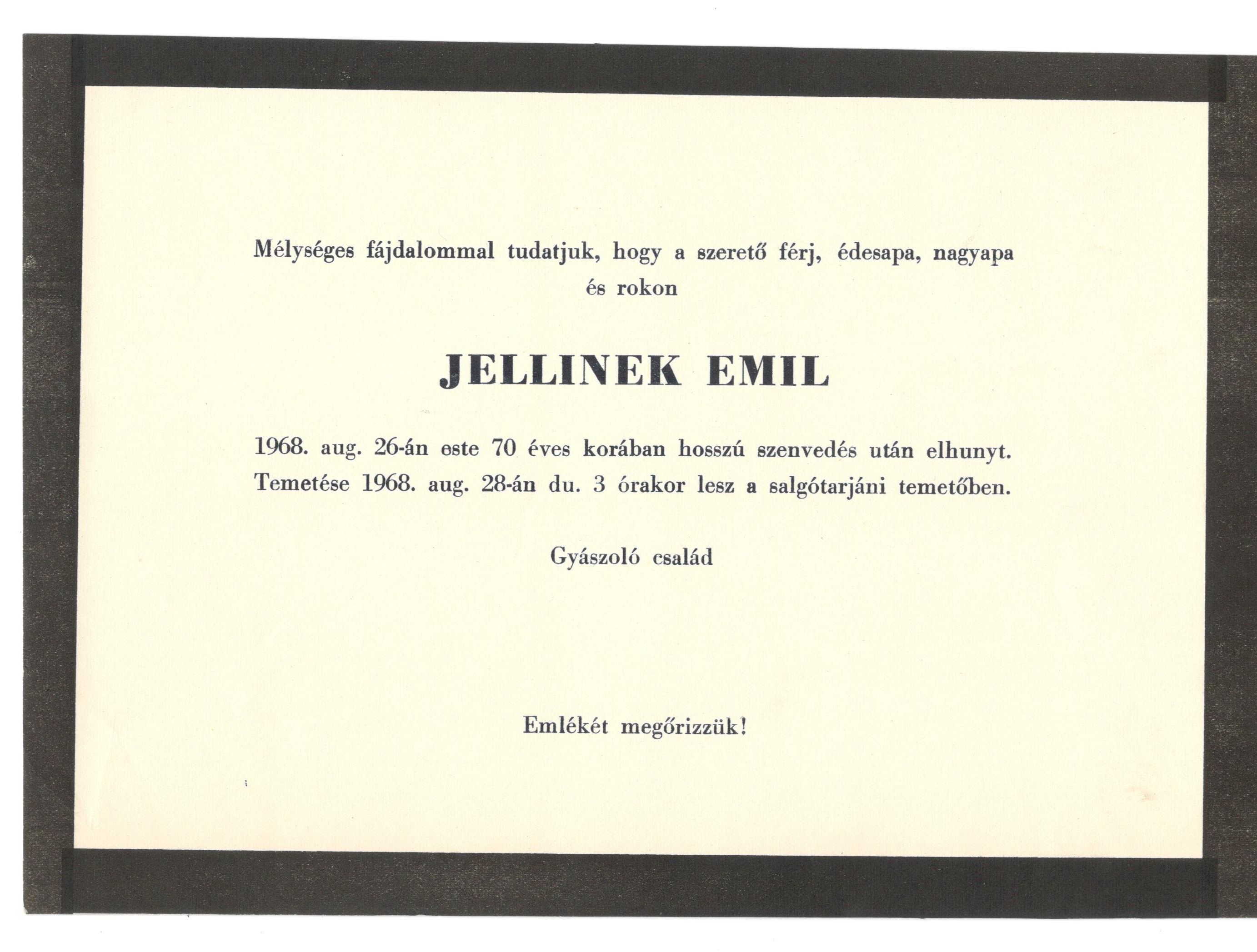 Temetése 1968. aug. 28-án du. 3 órakor lesz a salgótarjáni temetőben.