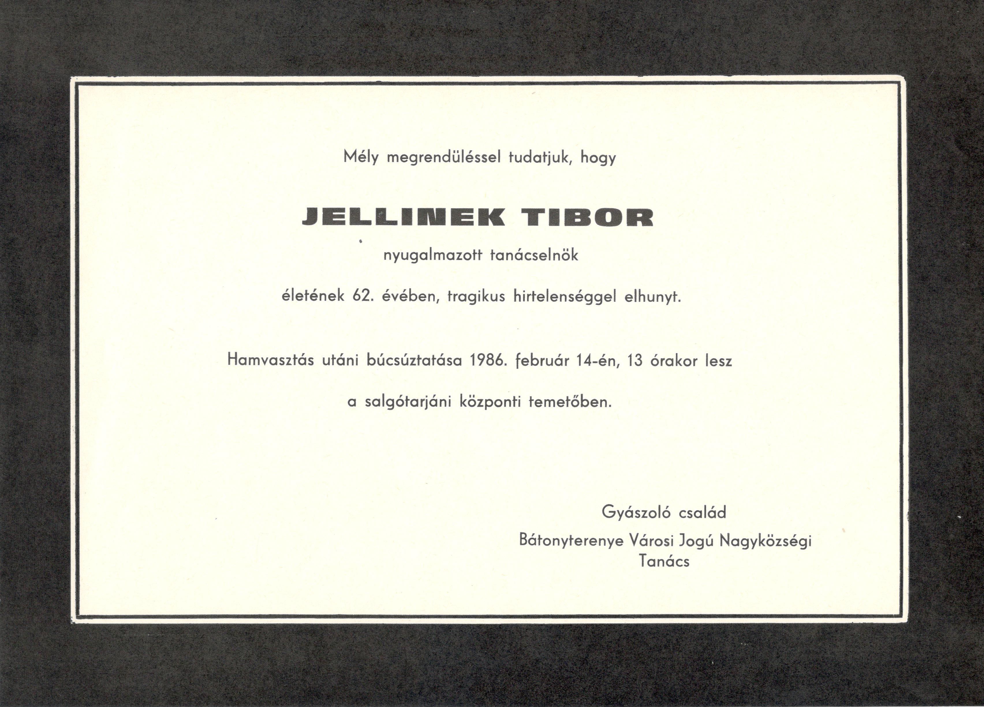 Gyászjelentés Jellinek Tibor haláláról