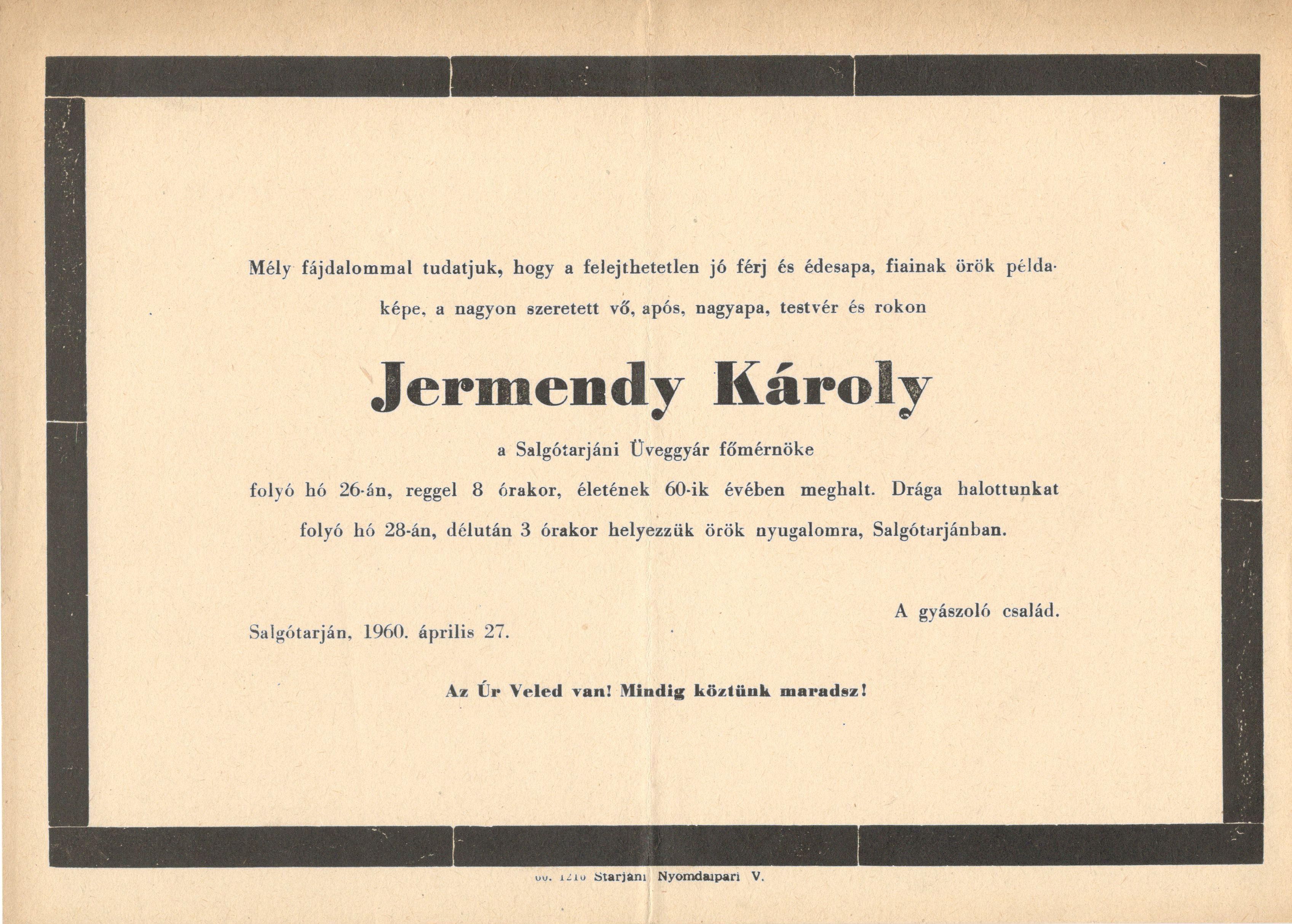 Gyászjelentés Jermendy Károly haláláról