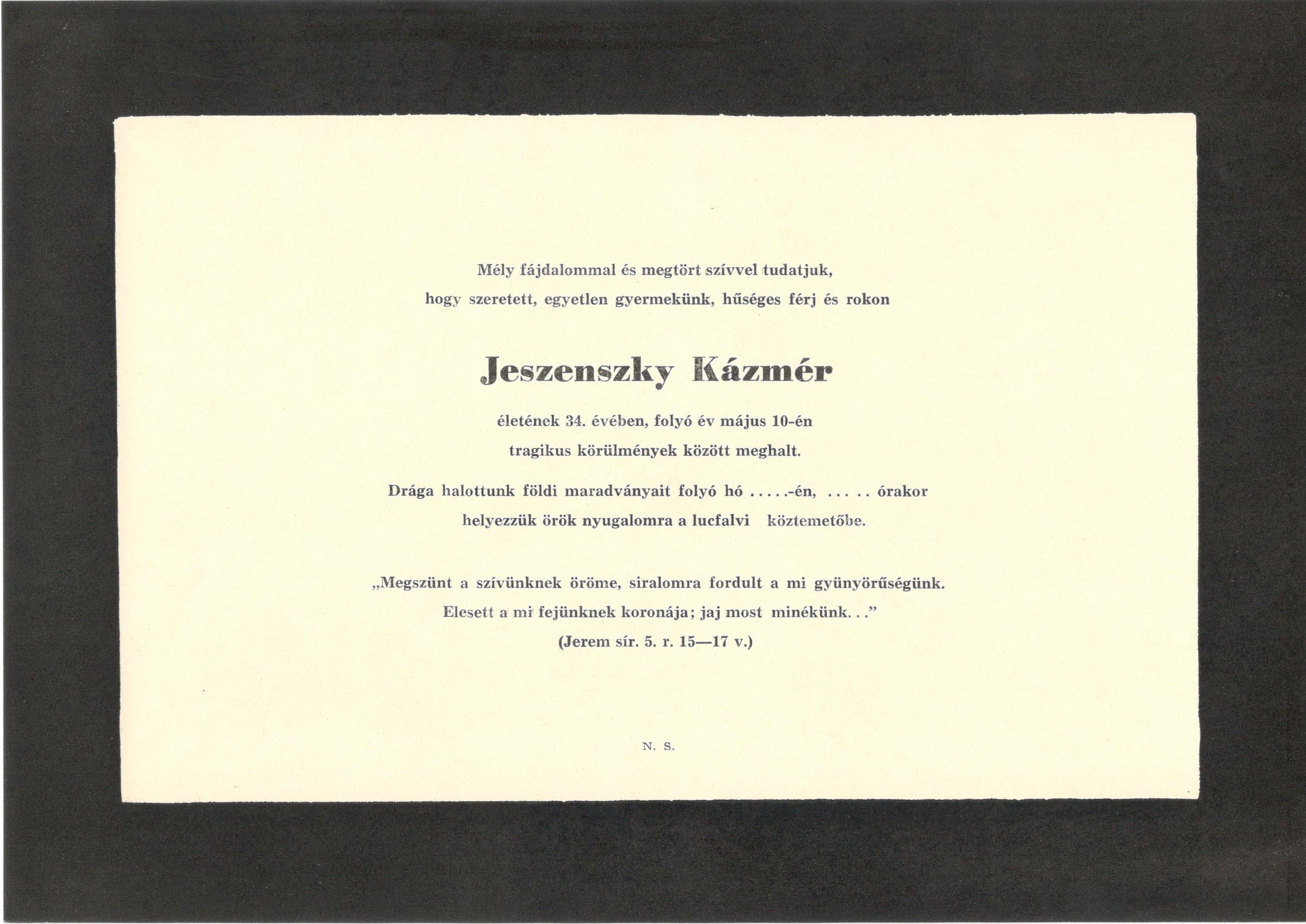 Gyászjelentés Jeszenszky Kázmér haláláról