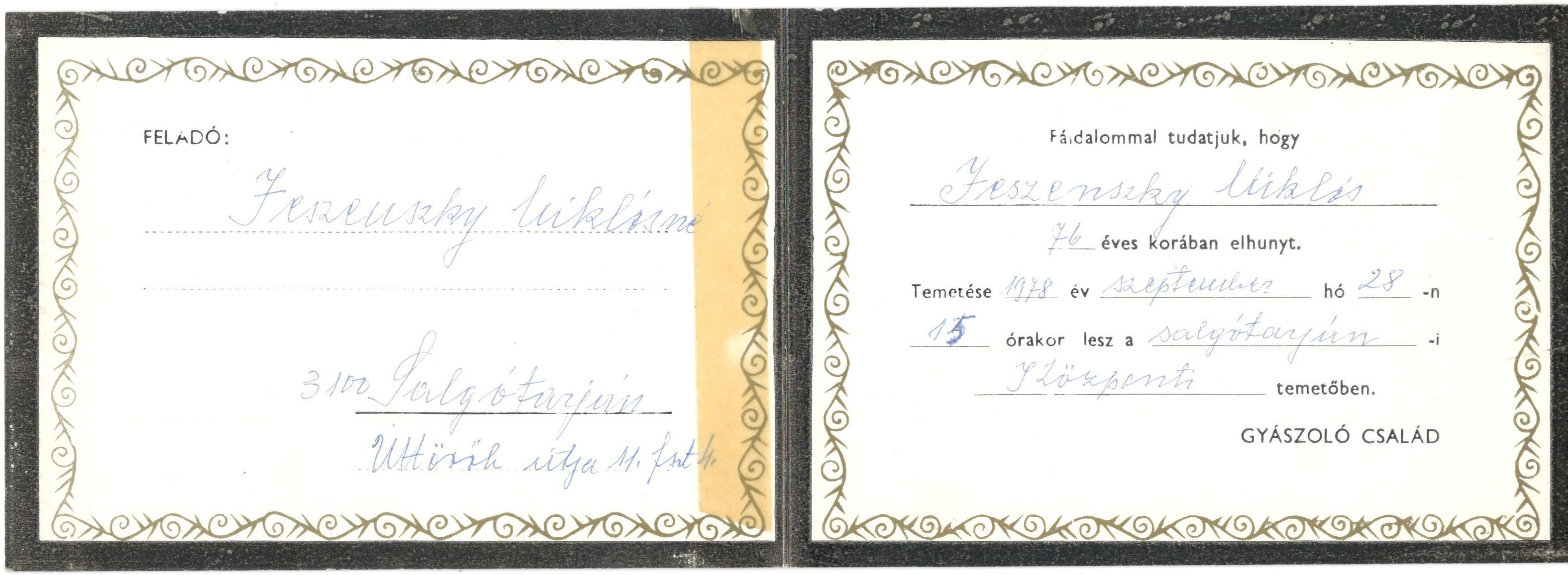 Temetése 1978 év szeptember hó 28-n 15 órakor lesz a salgótarján-i központi temetőben.
