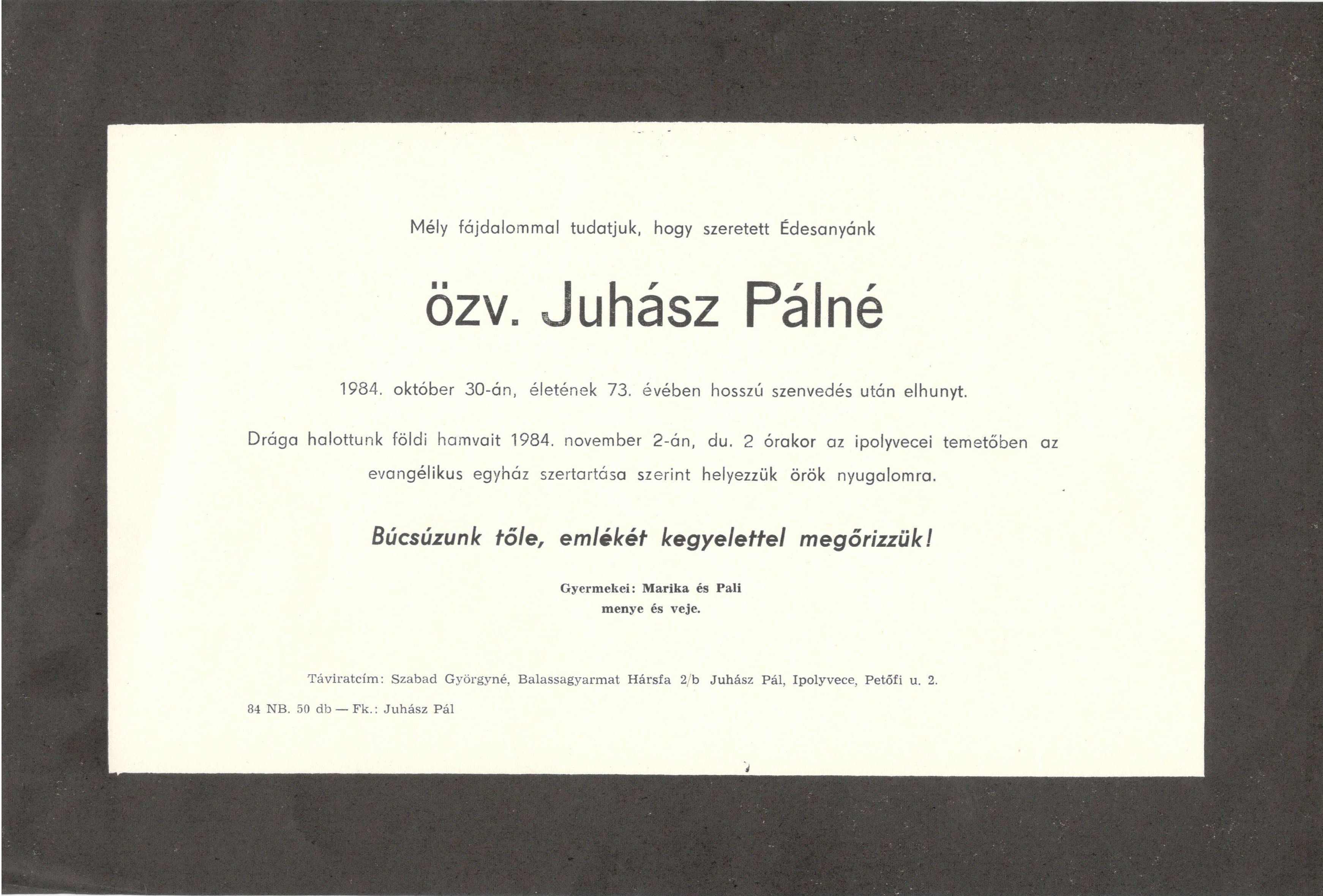 Drága halottunk földi hamvait 1984. november 2-án, du. 2 órakor az ipolyvecei temetőben az evangélikus egyház szertartása szerint helyezzük örök nyugalomra.