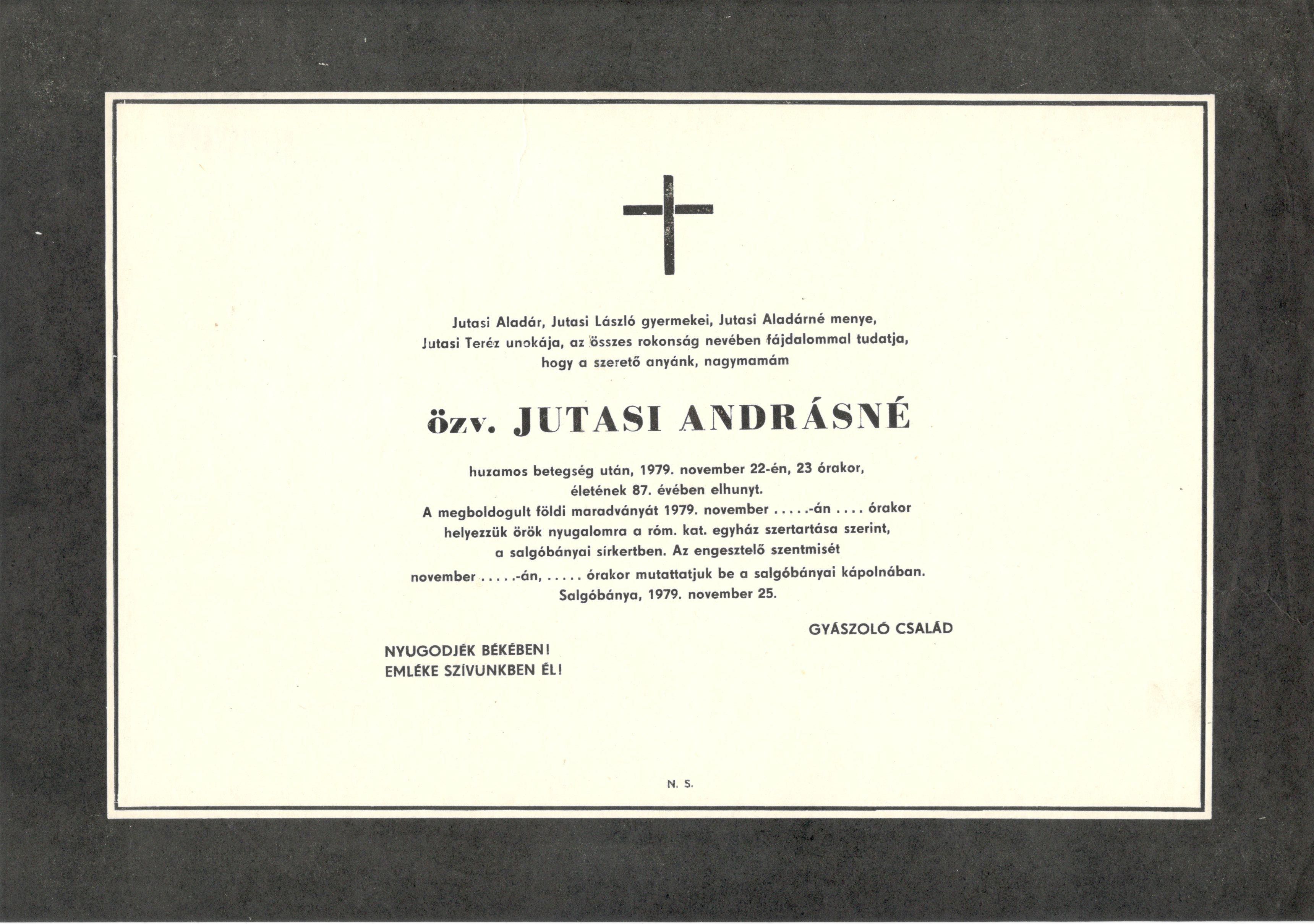 Gyászjelentés özv. Jutasi Andrásné haláláról