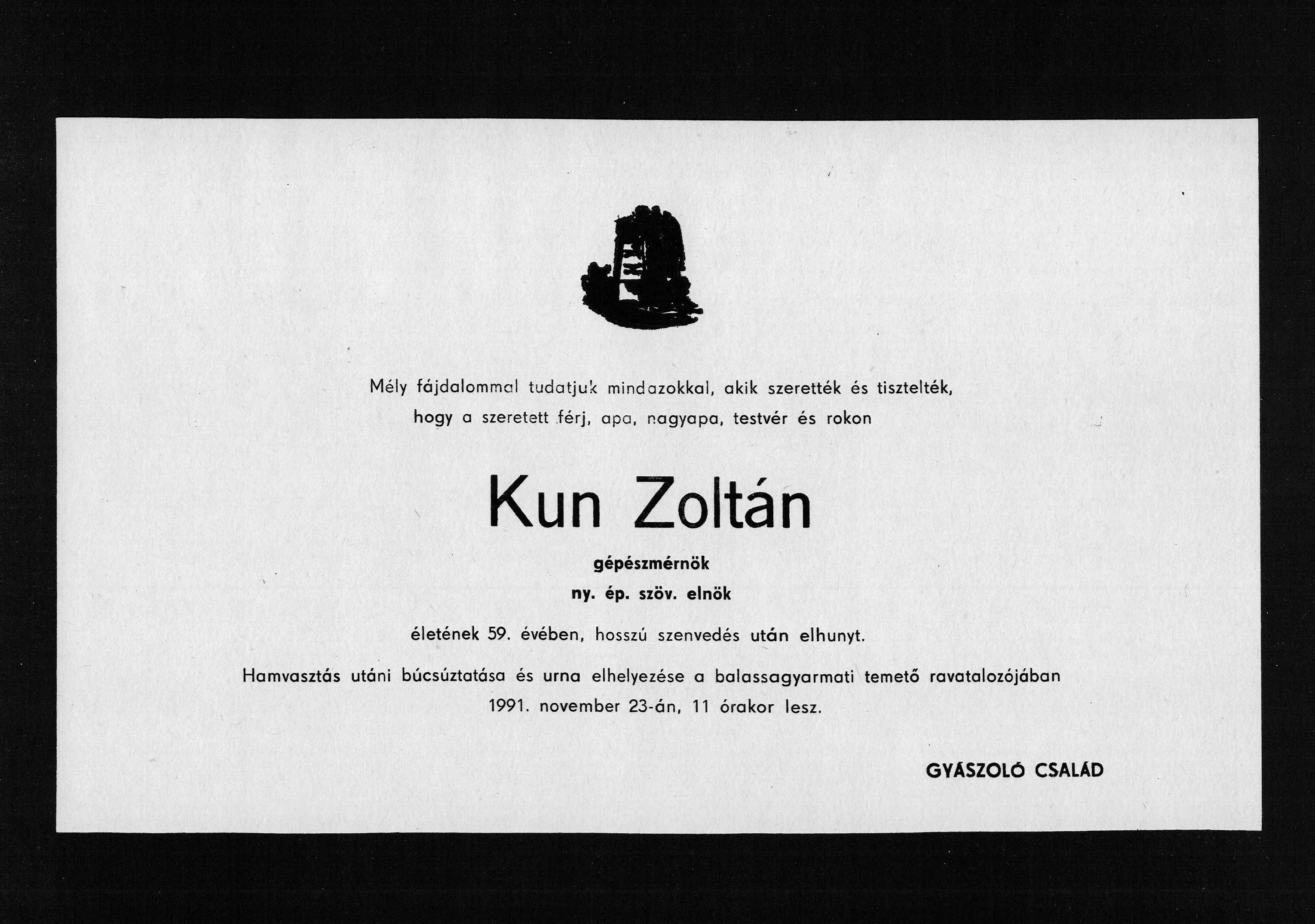 Gyászjelentés Kun Zoltán haláláról