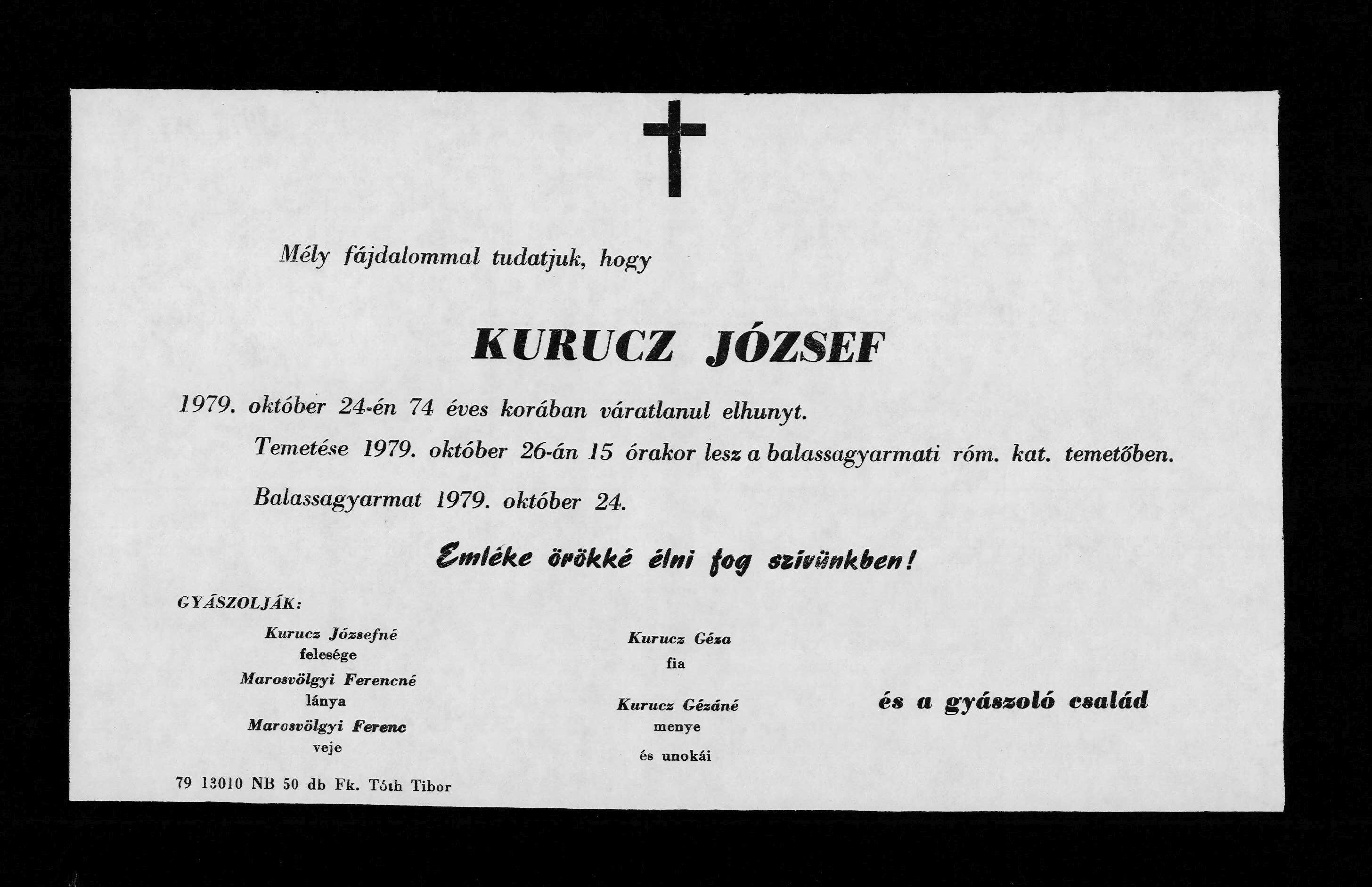 Gyászjelentés Kurucz József haláláról