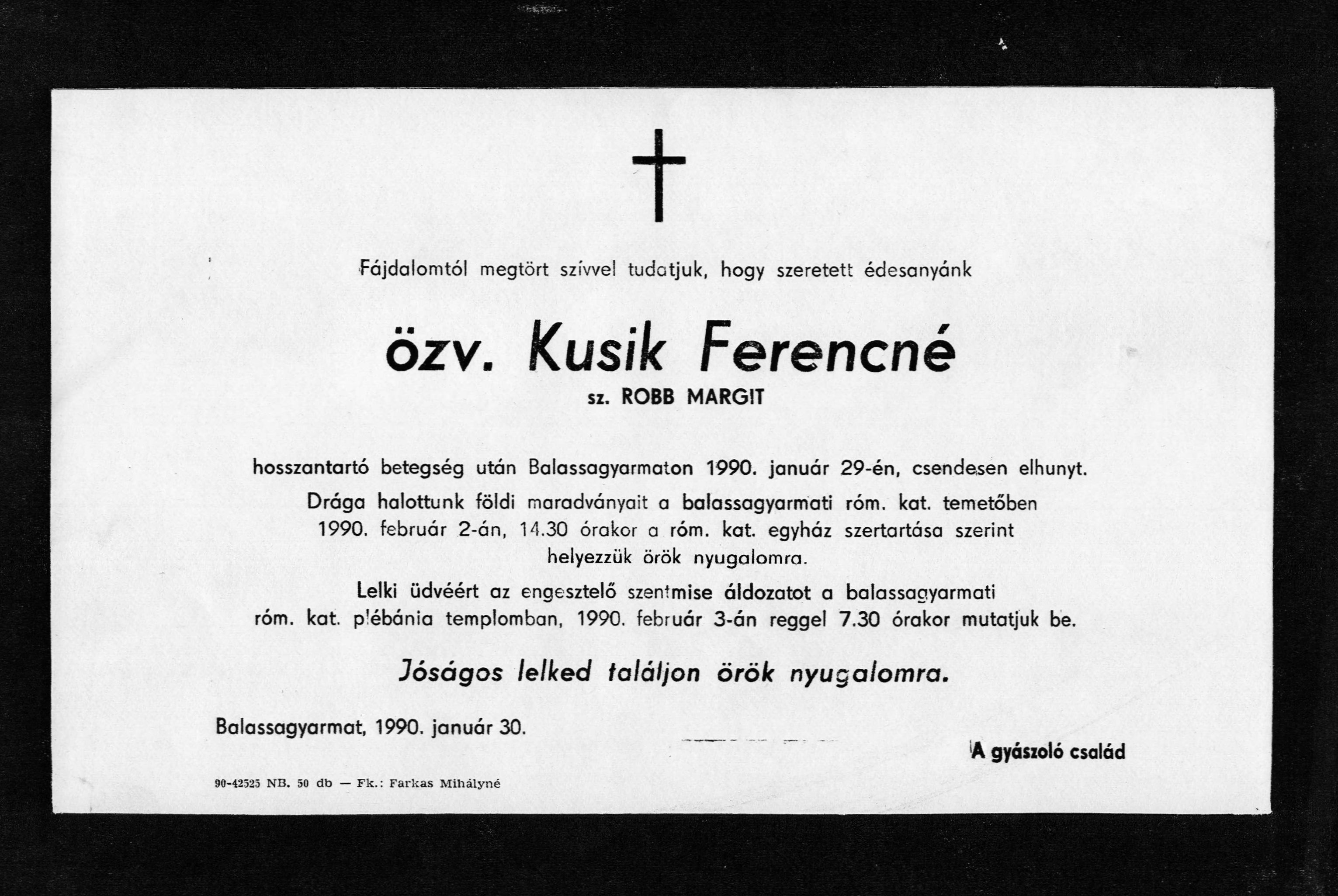 Gyászjelentés özv. Kusik Ferencné