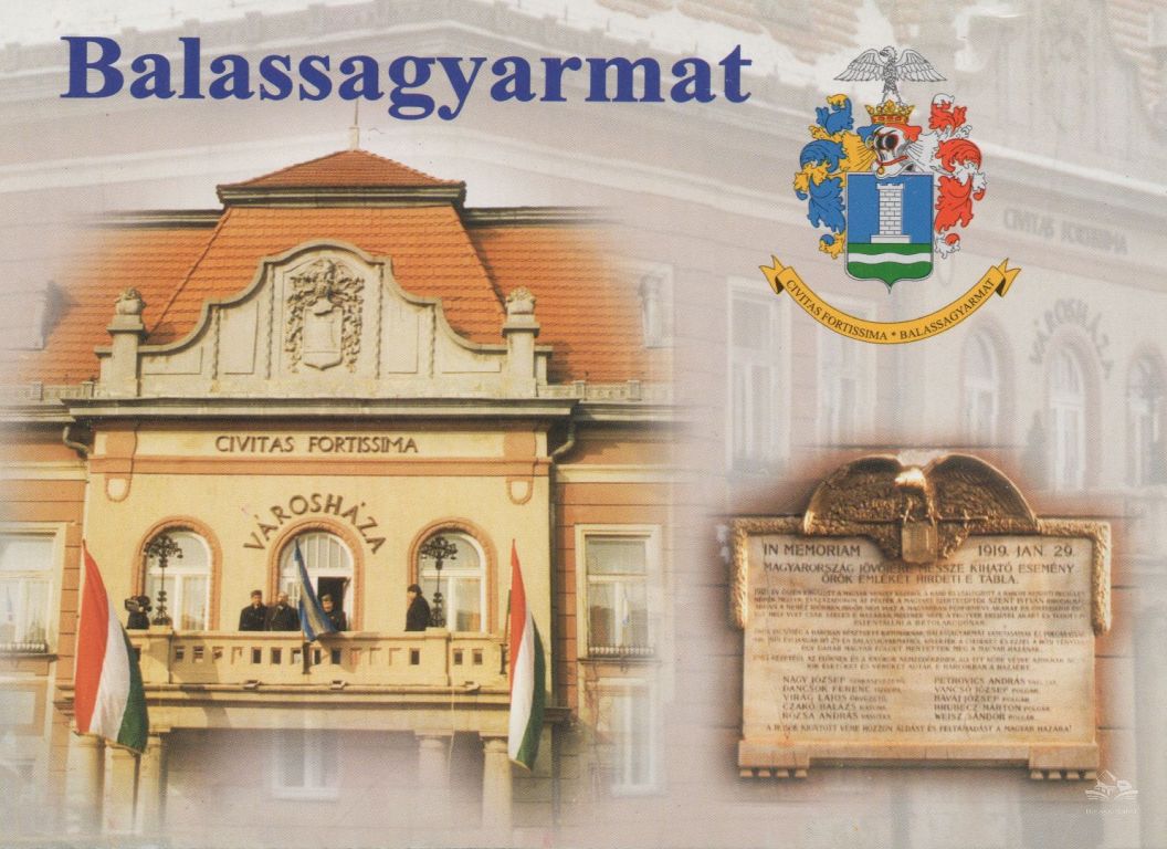 A képeslapon Balassagyarmat - Városháza és annak falán található a csehek kiverésének emléktáblája