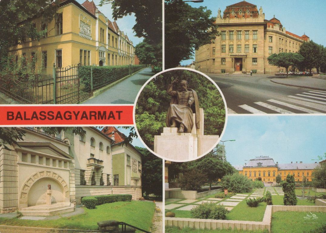 Az ötosztatú képeslapon Balassagyarmat jellegzetességei: az általános iskola (ma Kiss Árpád Általános Iskola, a Megyei Bíróság épülete, a Palóc Múzeum, a Vármegyeháza, középen Sidló Ferenc alkotása, Madách Imre ülő bronzszobra.