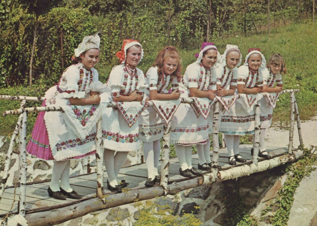 A képeslapon bánki népviseletbe öltözött asszonyok, lányok.