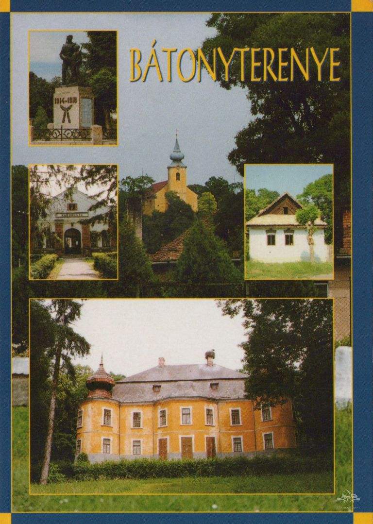 Áldások őrzik csendes nyughelyét."), alatta a volt nagybátonyi polgármesteri hivatal bejárata, középen a kisterenyei római katolikus templom, jobbra a palóc tájház Kisterenyén, legalul az 1790-ben, késő barokk stílusban épült Gyürky–Solymossy-kastély