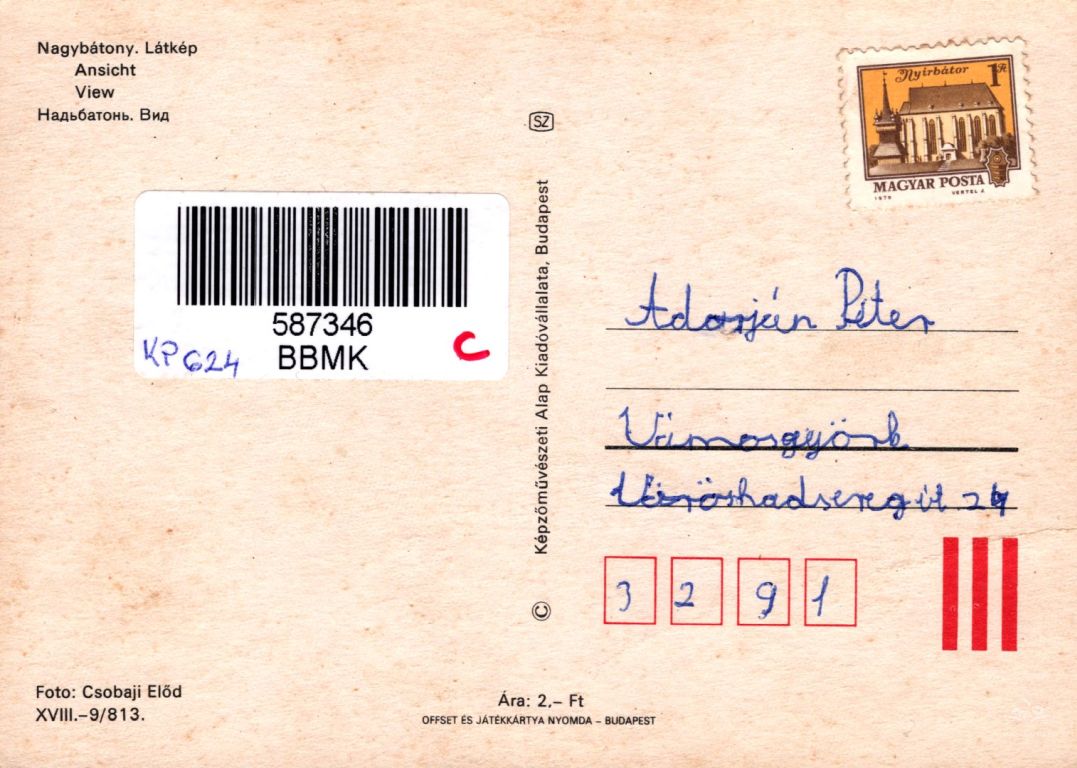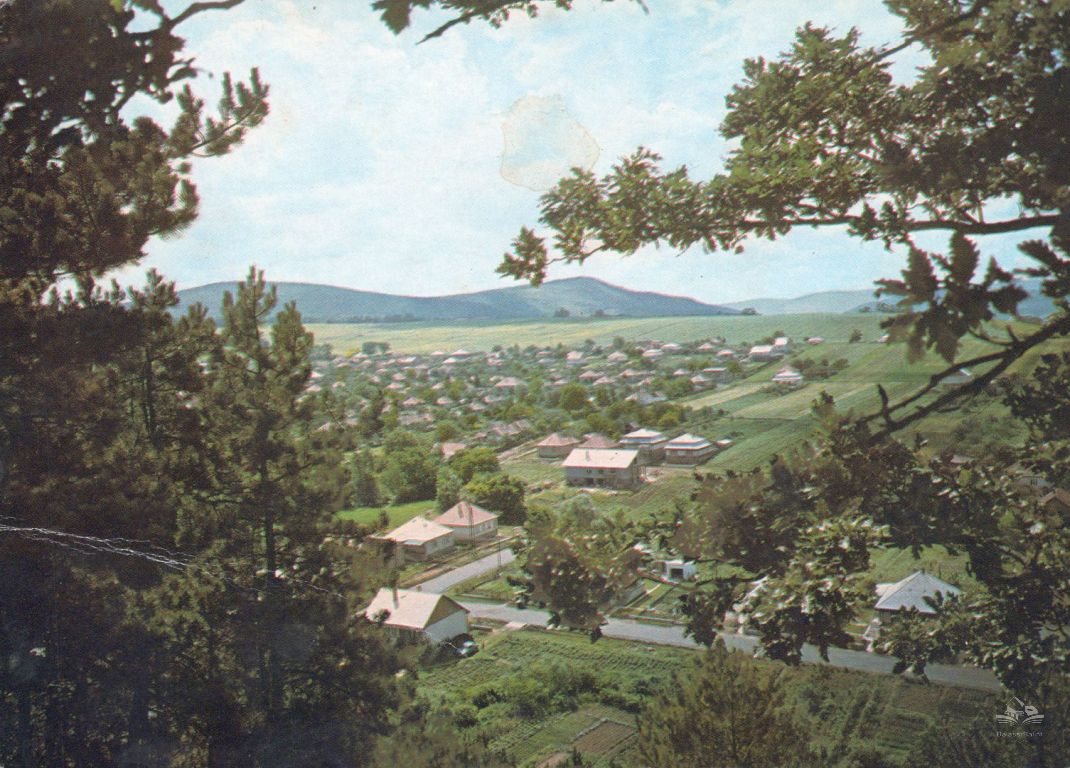A képeslapon előterében benyúló faágak, háttérben hegyek, Nagybátony látképe felülnézetből