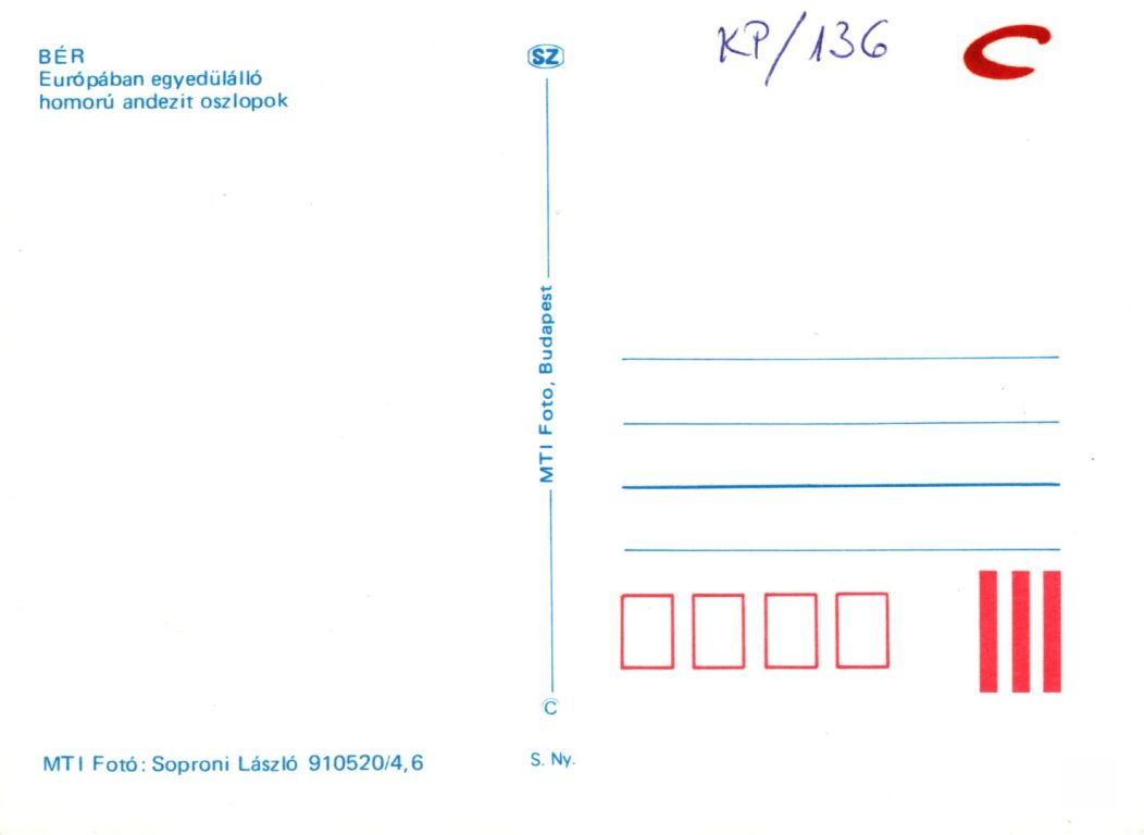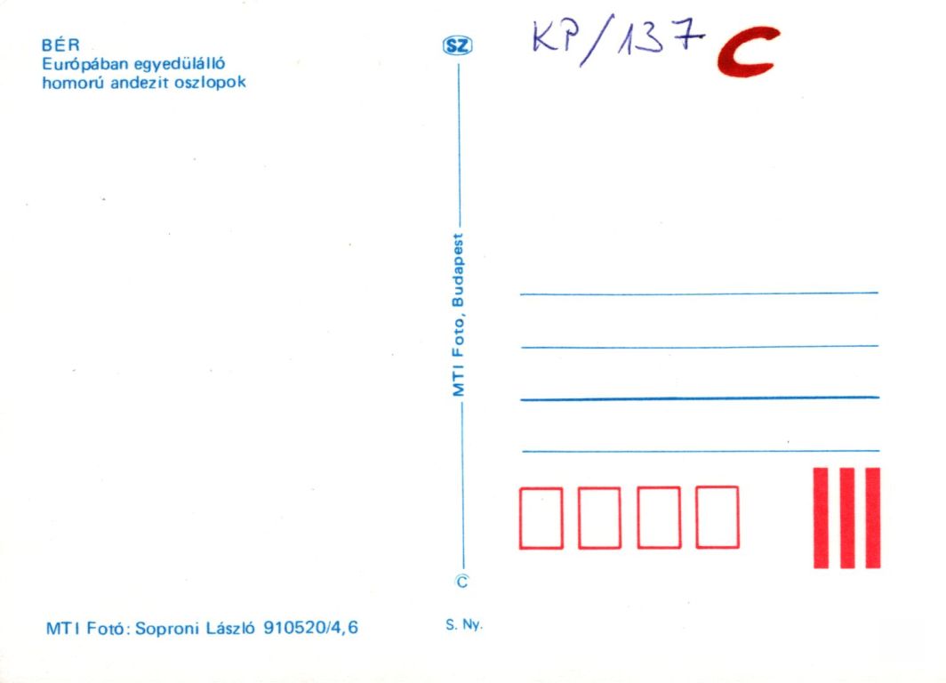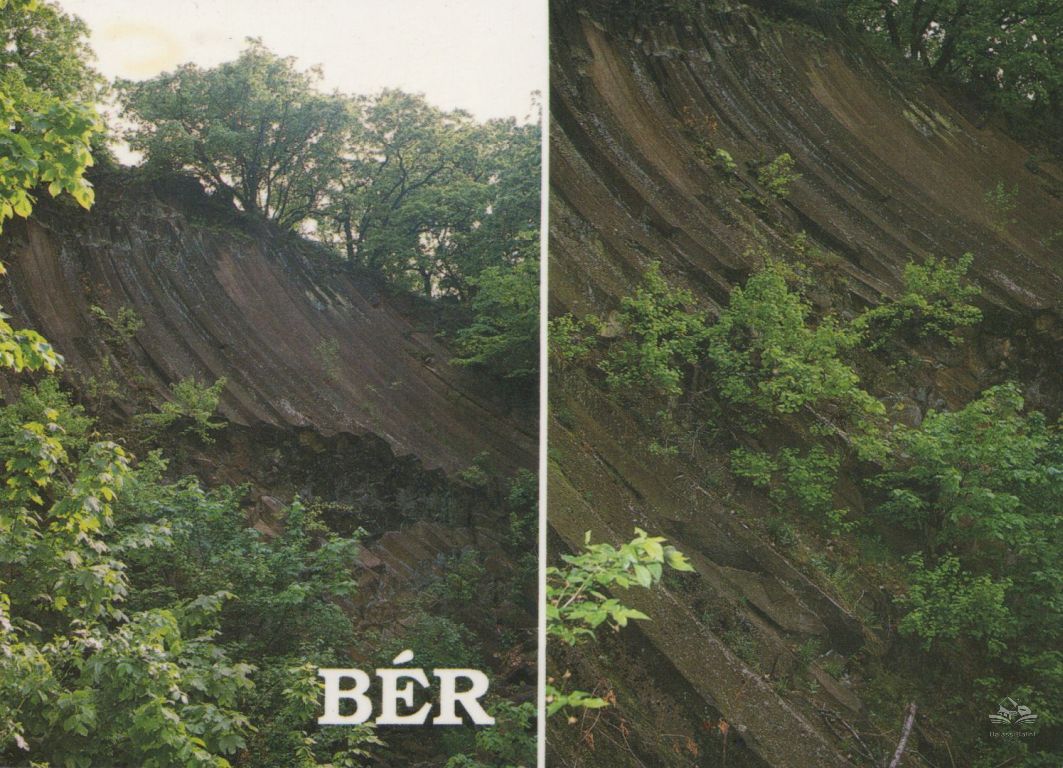 A kétosztatú képeslapon a Bér község mellett emelkedő vulkanikus eredetű andezit oszlopokból felépülő Nagy-hegy részlete