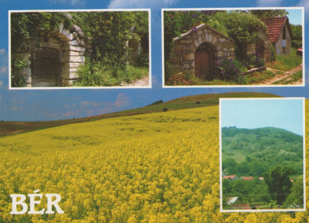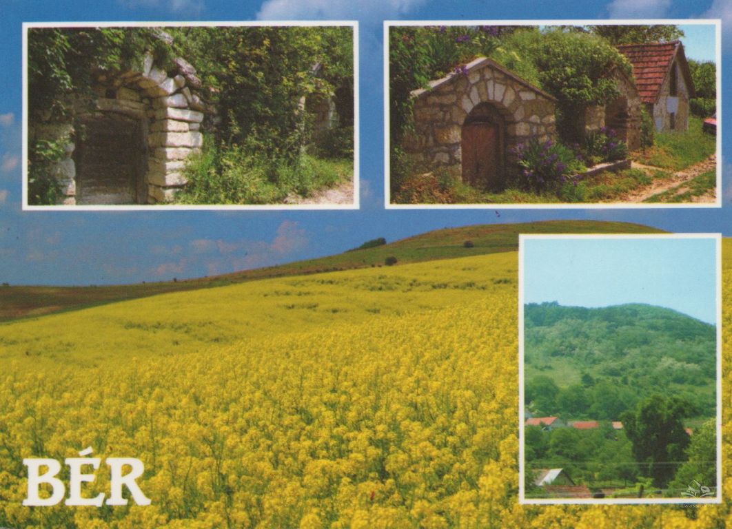 A négyosztatú képeslapon a béri pincesor - a falu északkeleti szélén csaknem hetven pince emlékeztet a szőlőművelés hagyományaira. A pincesor nagy része a XIX. század közepén épült, 1663-ból két borospince maradt meg, és látkép repcefölddel