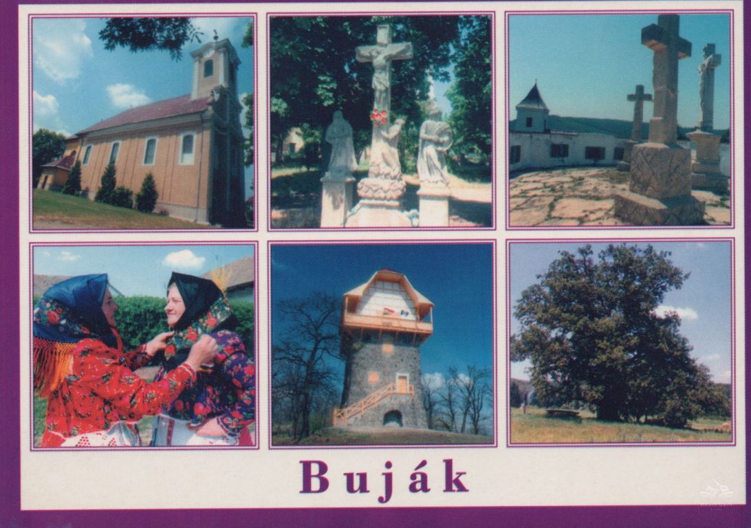 A hatosztatú képeslapon bujáki részletek - templom, kereszt, Kálvária, népviselet, kilátó, keselyréti védett, öreg tölgy, felirata a lap alján: "Buják"