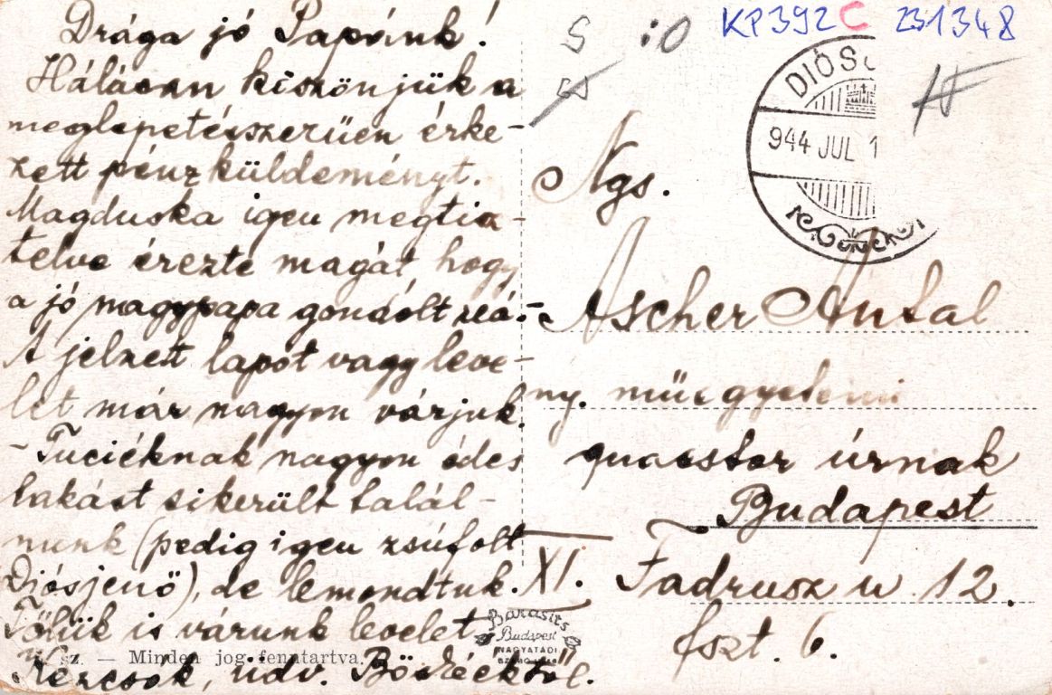 Szöveg: Drága jó Papánk! Hálásan köszönjük a meglepetésszerűen érkezett pénzküldeményt. Magduska igen megtisztelve érezte magát, hogy a jó nagypapa gondolt reá. A jelzett lapot vagy levelet már nagyon várjuk. Juciéknak nagyon édes lakást sikerült találnunk (pedig igen zsúfolt Diósjenő), de lemondtuk. Tőlük is várunk levelet. Kézcsók, üdv. Böskééktől.