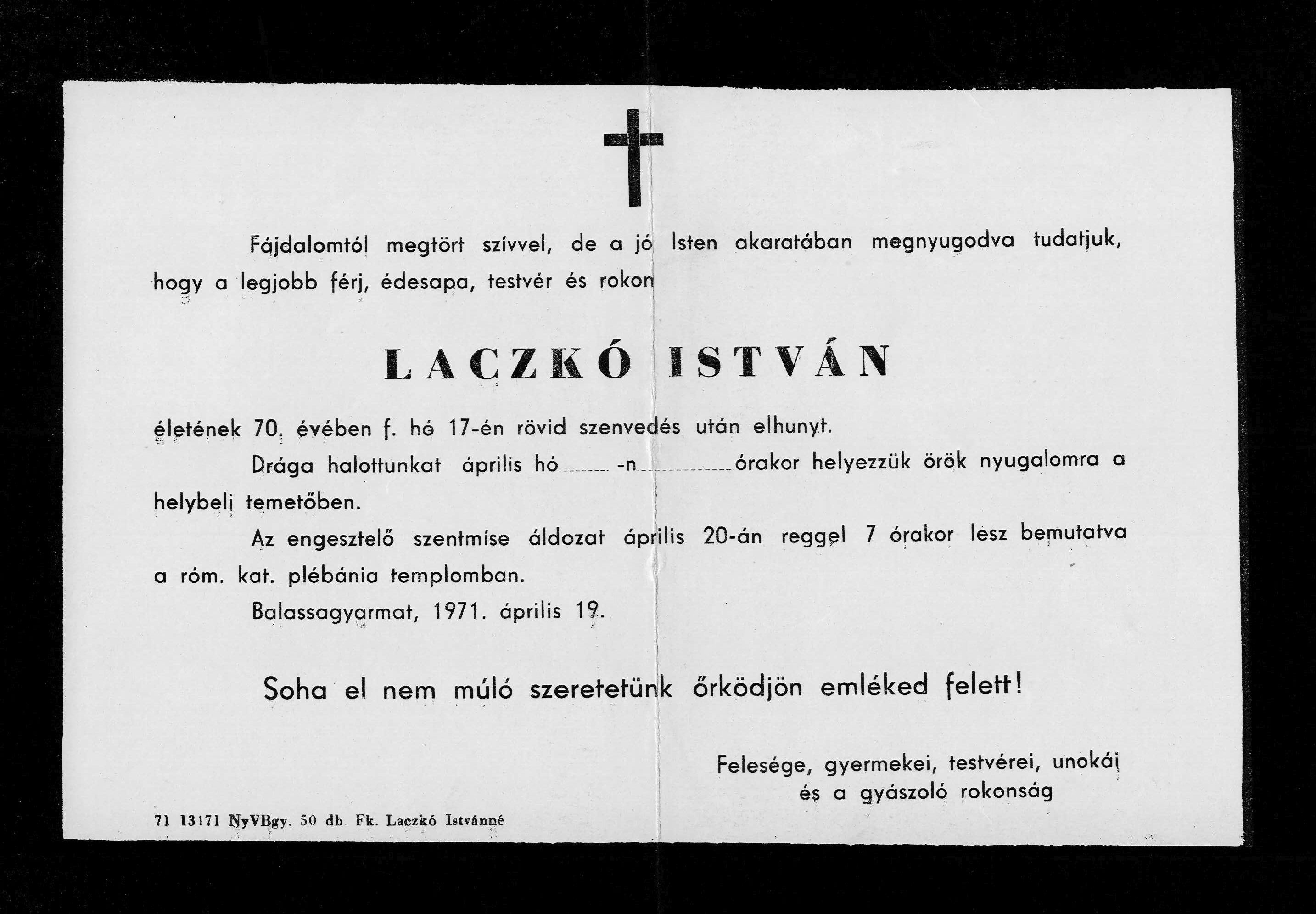 életének 70. évében f. hó [1971. április] 17-én rövid szenvedés után elhunyt.