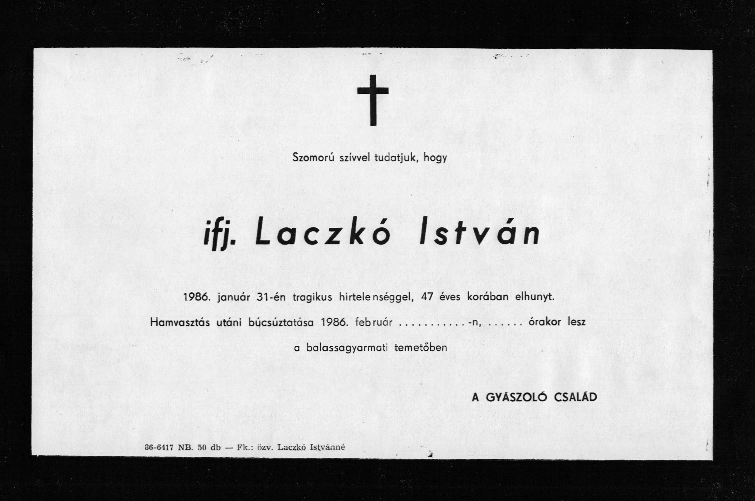 Gyászjelentés ifj. Laczkó István haláláról