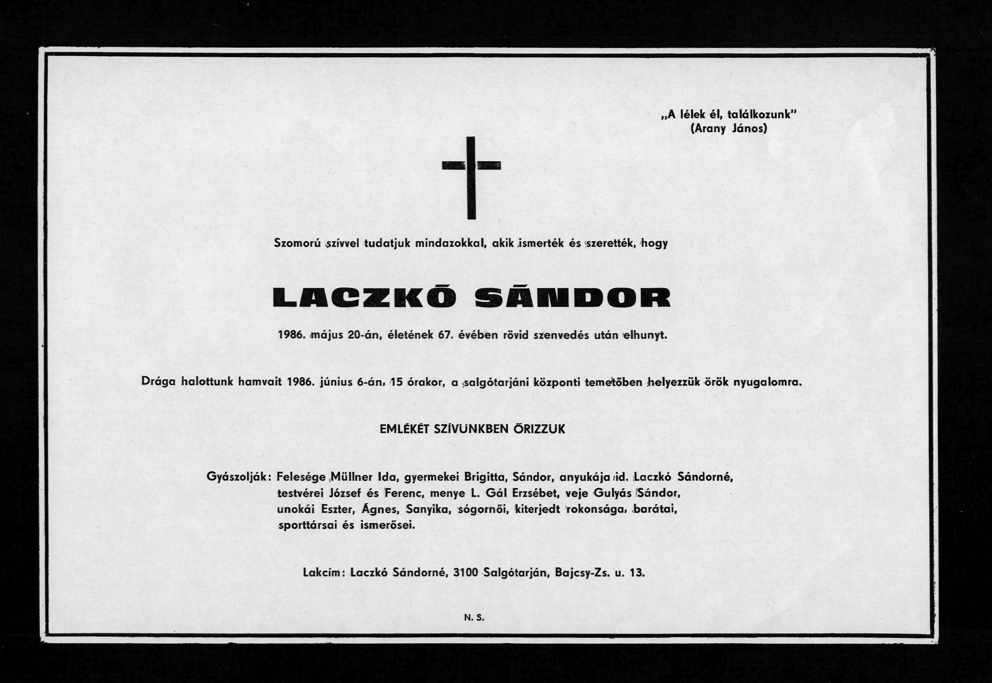 Gyászjelentés Laczkó Sándor haláláról