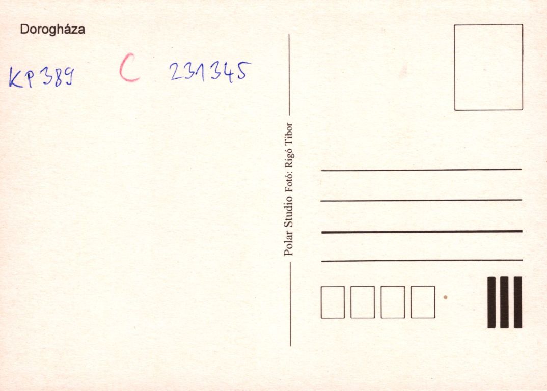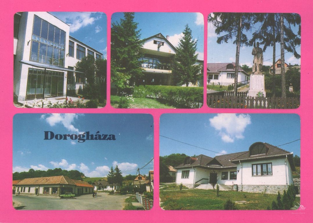 Az ötosztatú képeslapon dorogházai részletek - fent az általános iskola, művelődési ház, világháborús emlékmű. Lent utcakép, orvosi rendelő.