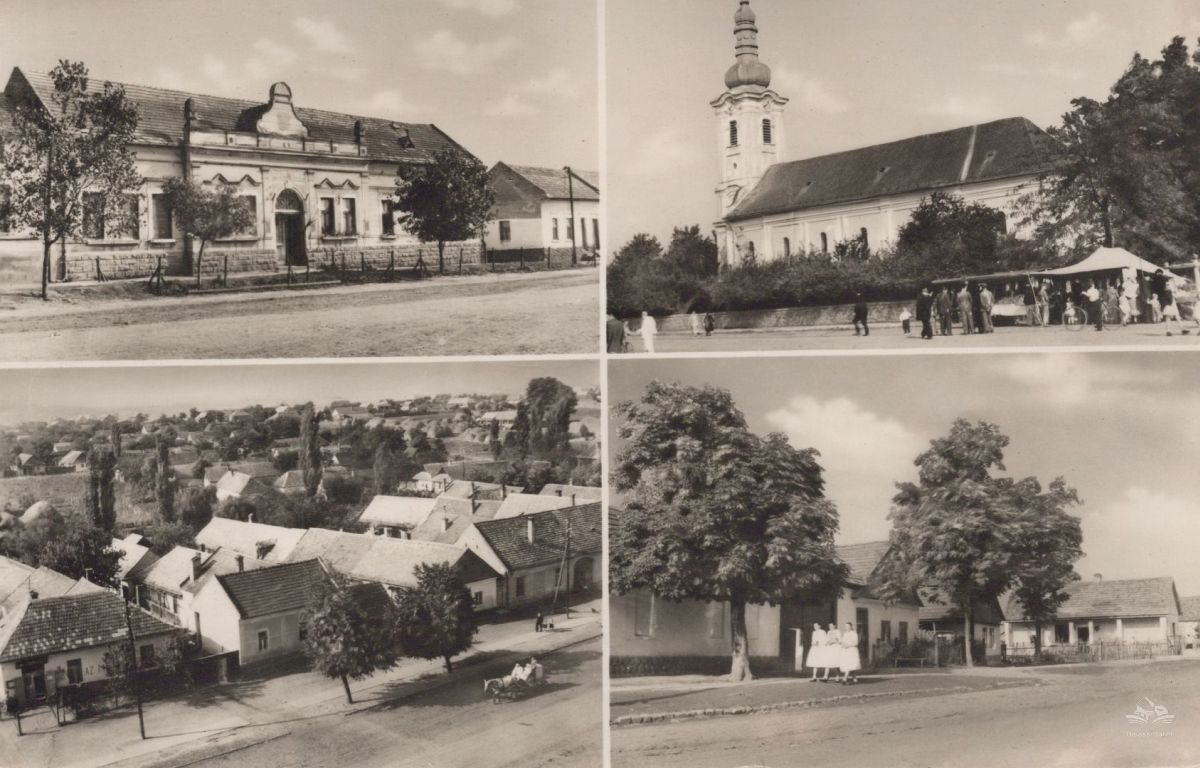 A négyosztatú képeslapon érsekvadkerti részletek - a községháza, a Szent András templom, látkép a faluról, utcarészlet.
