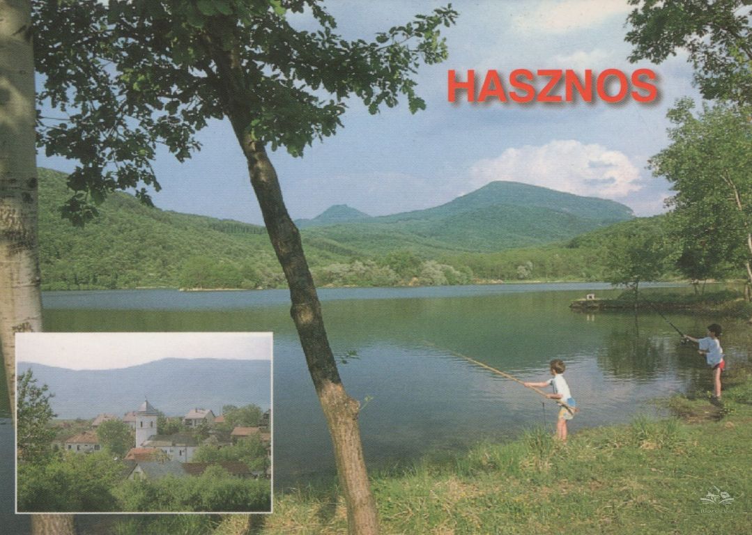 A kétosztatú képeslapon a Hasznosi víztározó (A Hasznosi víztározó a Mátra nyugati lankái között található. A tó 1973 és 1986 között jött létre a Kövecses patak felduzzasztásával. Elsődleges célja, hogy ivóvízzel lássa el a környező településeket. A tározót a Csörgő patak és a Mátrából lefolyó esővíz táplálja. A tó területe 23 hektár, mely mintegy 2 millió köbméter víz tárolására teszi alkalmassá. Átlagmélysége 17 méter... forrás: komra-hasznos.hu), a Római Katolikus templom - Mária Magdolna templom - (A XV. században gótikus stílusban épült templom hajóját a középkori falak felhasználásával 1740-ben alakították ki barokk stílusban. Mellékhajója a XIX. században készült.