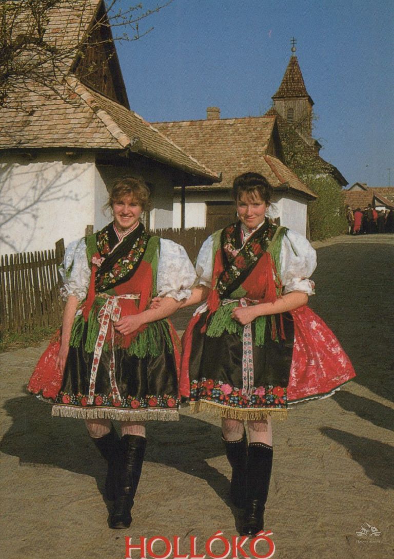 A képeslapon hollókői népviseletbe öltözött leányok, Hollókó Ófalu utcájában