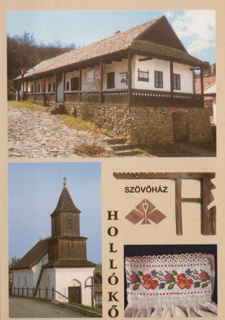 A képeslapon a hollókői Szövőház épülete, a fatornyos templom, szőttes