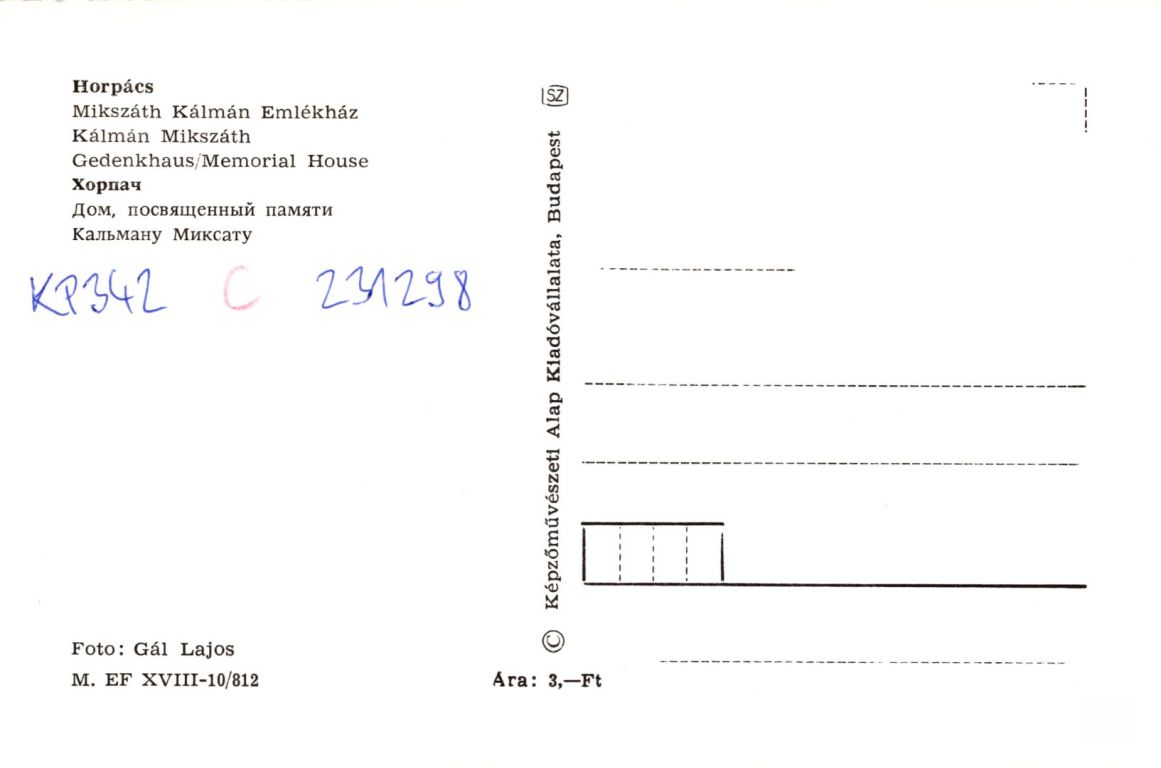 A képeslapon a horpácsi Mikszáth Kálmán Emlékház -Mikszáth-kúria -, mely 1906-ban épült eklektikus, görögös, neoklasszicista stílusban az író, Mikszáth Kálmán fia, ifjú Mikszáth Kálmán tervei alapján - kiállítási tárgyak