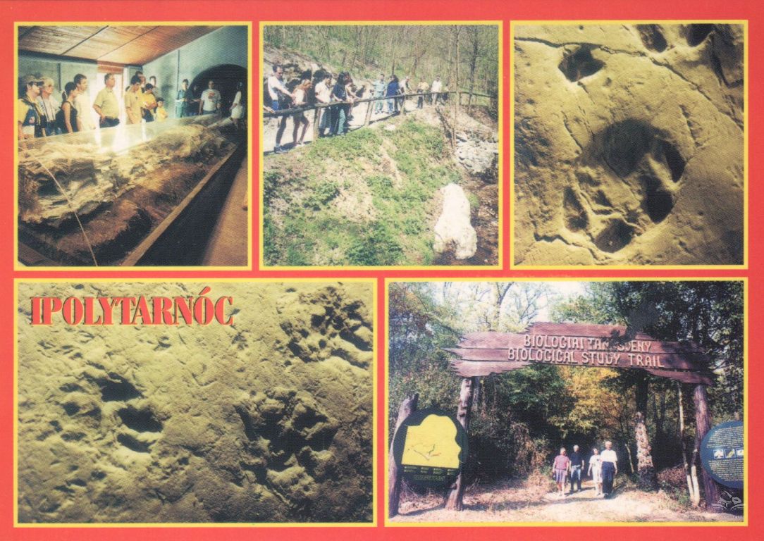 Az ötosztatú képeslapon Ipolytarnóci Ősmaradványok Természetvédelmi Terület részletei - megkövesedett fatörzs, leletek-őslábnyomok, tanösvény bejárata
