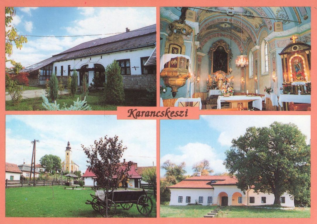 fent kultúrház (2011-ben átépítették, ma Platthy József Általános Művelődési Központ), római katolikus templom-templombelső az oltárral, lent: a római katolikus templom, a késő barokk stílusú, 1796-ban épült volt Zahorszky-Prónai kúria