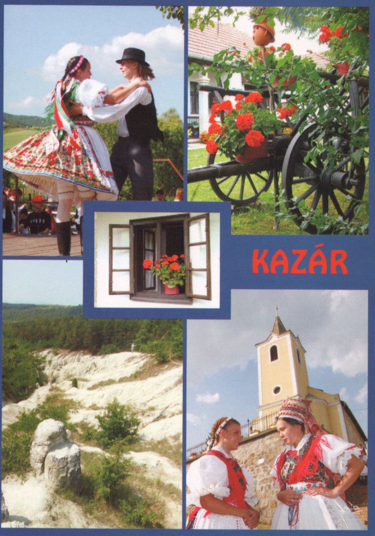 Az ötosztatú képeslapon kazári részletek - népviseletes pár, virágos szekér, muskátlis ablak, riolittufa, római katolikus templom előterében népviseletes nők
