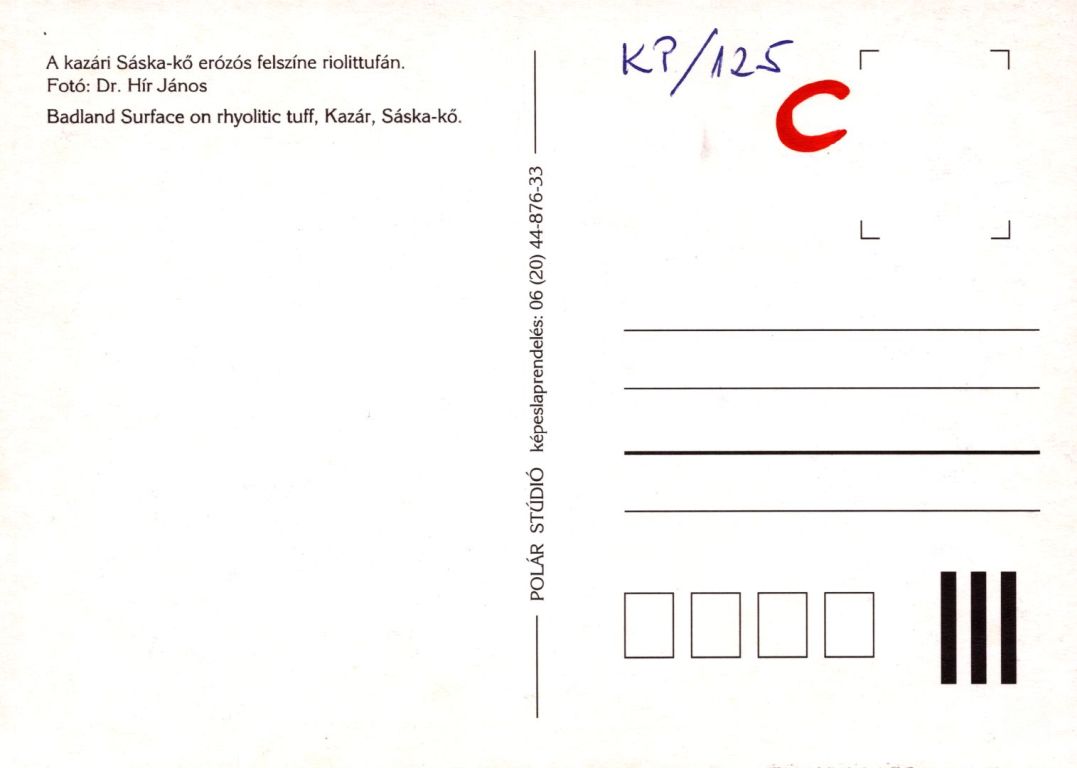 Képeslap hátoldalán: A kazári Sáska-kő eróziós felszíne riolittufán.