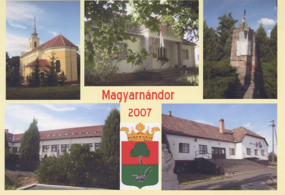 Községháza, I.-II. Világháborús emlékmű, iskola, Művelődési ház. Az alsó sorban középen grafika a község címeréről, felirat középen: "Magyarnándor 2007"