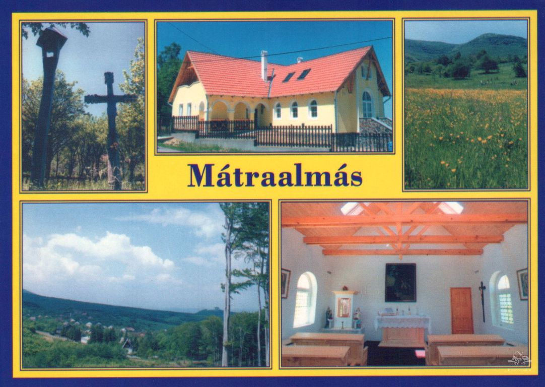 Az ötosztatú képeslapon mátraalmási részletek - népi jellegű tölgyfa feszület és harangláb 1868-69-ből, Szent Imre kápolna épülete, tájkép, látkép, a Szent Imre kápolna templombelső, középen Mátraalmás felirat