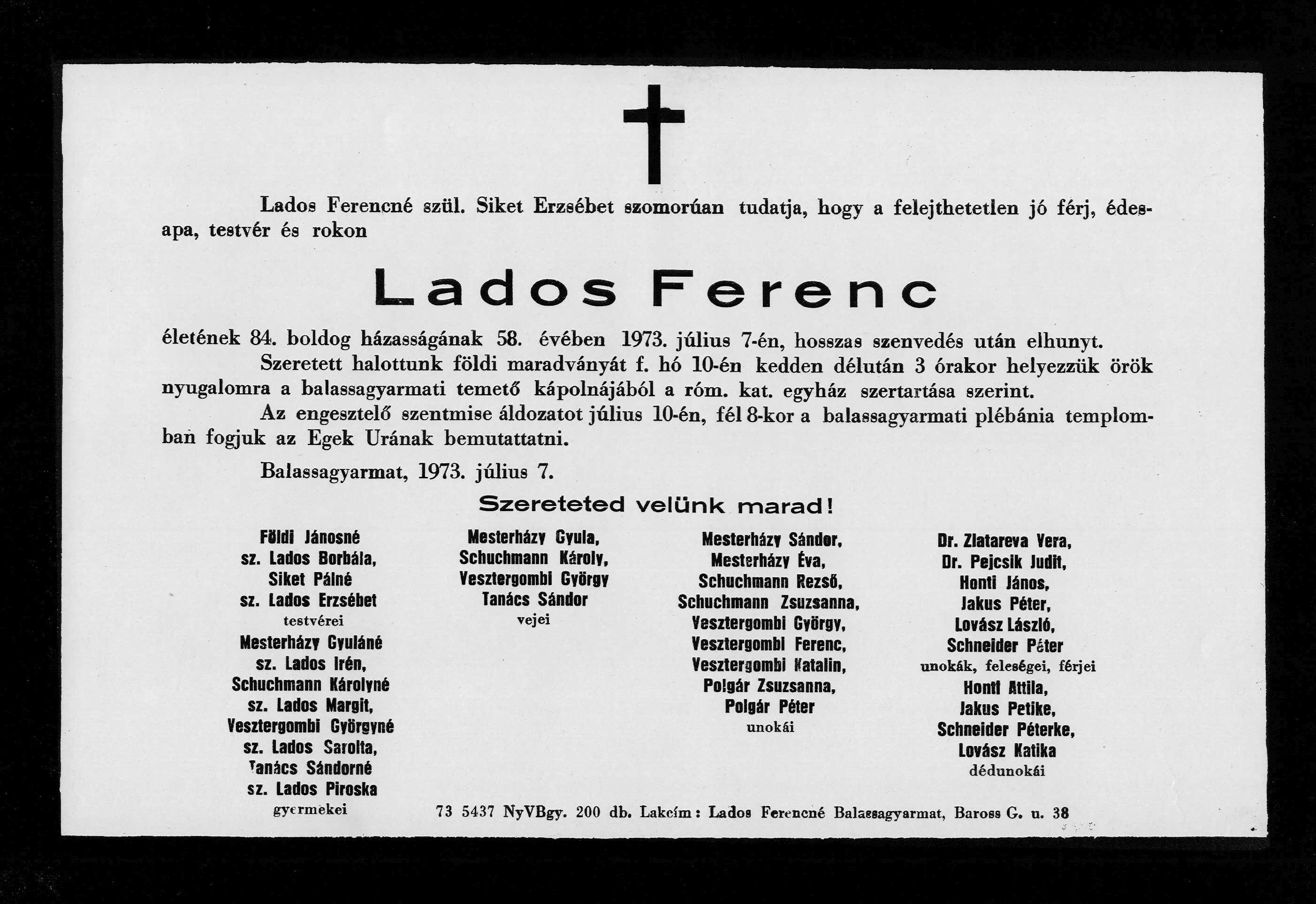 Gyászjelentés Lados Ferenc haláláról